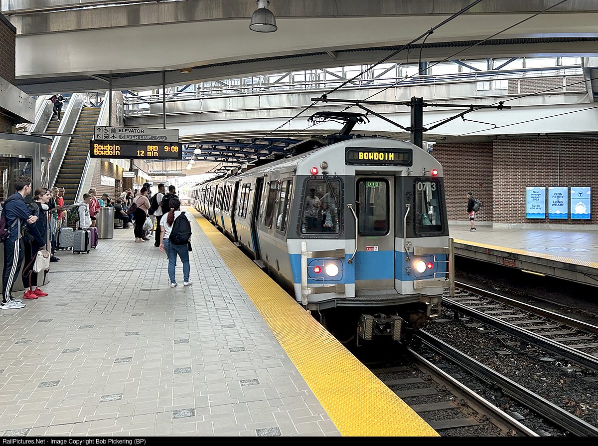 The 0700's built by Siemens replaced the 0600's #4 cars in 2007. Seen at the new Airport with "MBTA Dog" at the controller. Here, trains switch between overhead and 3rd rail.