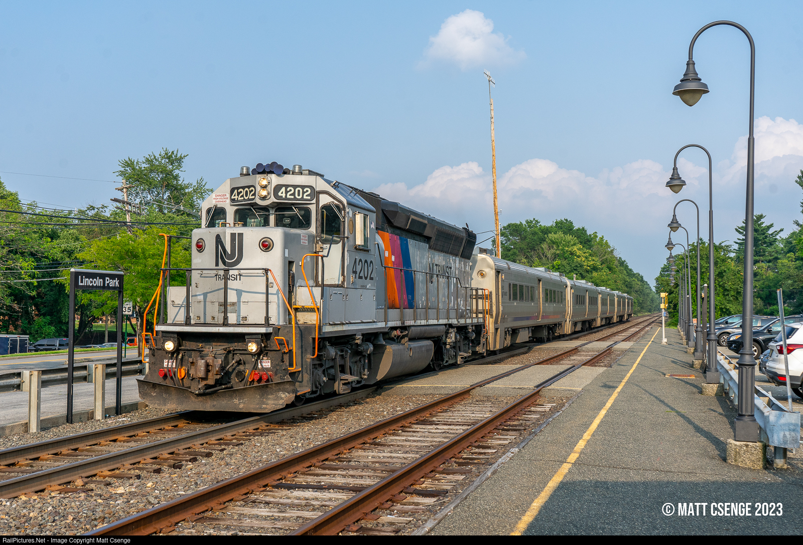 NJ Transit GP40PH-2B no. 4202 (EMD, 1965-1969) is seen leading westbound Montclair-Boonton Line train 1055 into Lincoln Park Station. The station features one main track and a siding, which passengers have to cross to board trains on the main. |