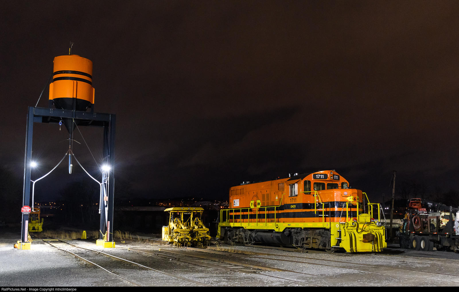 It's a quiet night at the Pittsburgh & Ohio Central Railroad's yard in McKees Rocks, Pennsylvania. OHCR 1711, painted for the P&OC, sits next to the sanding tower, illuminated by the lights at the yard office. This is one of the locomotives that was identified to be scrapped as part of the G&W settlement with the EPA.
