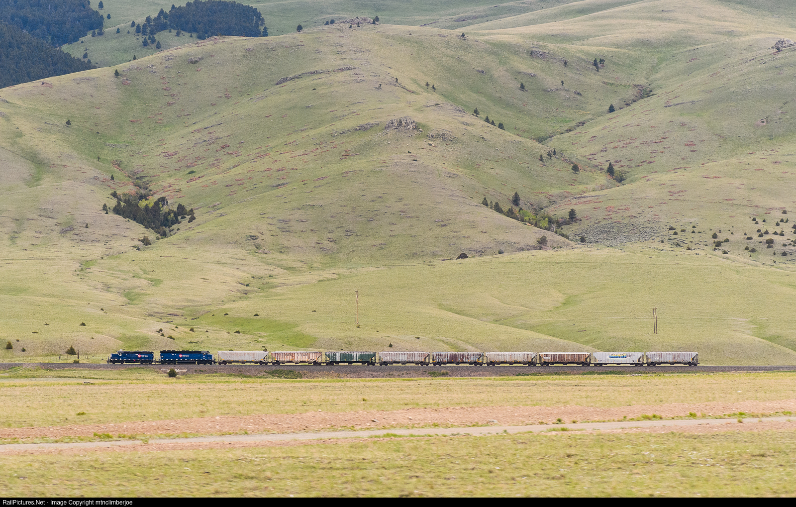 | Dwarfed by the surrounding terrain, Montana Rail Link's Helena Local heads east as it descends Winston Hill outside of Winston, Montana behind a GP9 and SD45. The train is bound for Townsend at the bottom of the hill, where it will work the Graymont Limestone Quarry as well as pick up some ballast cars from the siding in town before heading back towards Helena. |