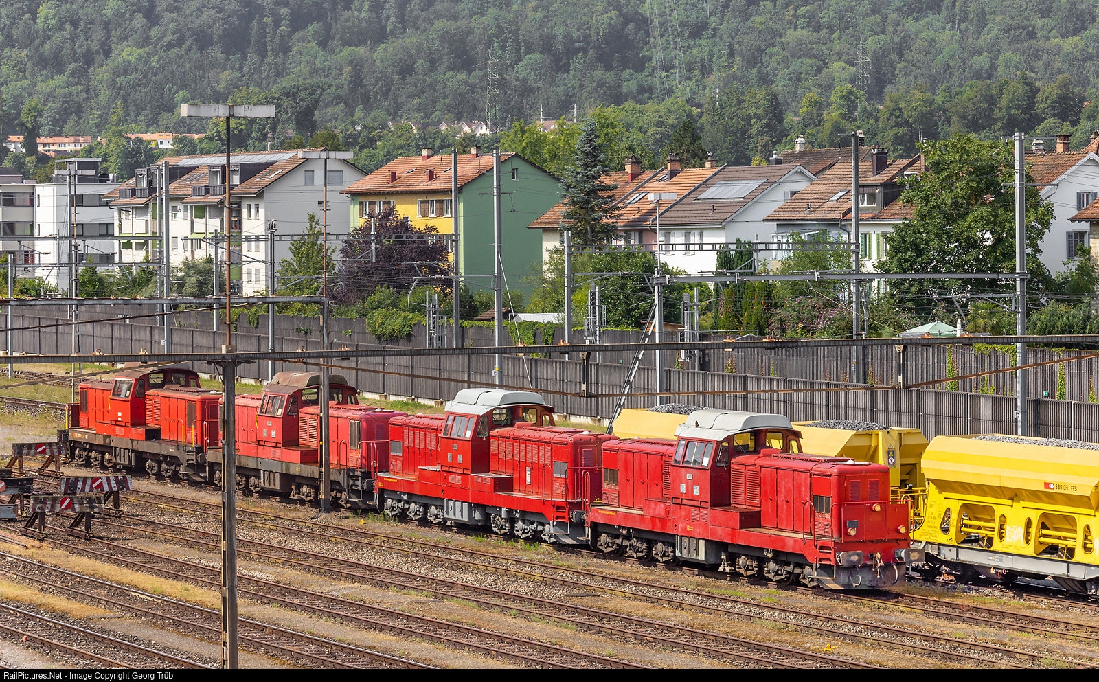 Privately owned, former SBB, diesellocomotives Bm 6/6 # 18511, 18501, 18508 and 18507 (from right to left) stabled in Winterthur freight yard. The sixaxle dieselelectric Bm 6/6 (Bm 860) were built in 1954/1961 in a series of 14, have two Sulzer 6LDA25 prime movers with a total power of 956 kW, and were withdrawn from 1999. Some of the locomotives have been scrapped in the last years. One, # 18505, ist operational for the Oensingen-Balsthal-Bahn, it was owned by SBB Historic before. # 18510 will be preserved operational by a new founded association in Etzwilen. The fate of the 4 locomotives pictured here is uncertain.