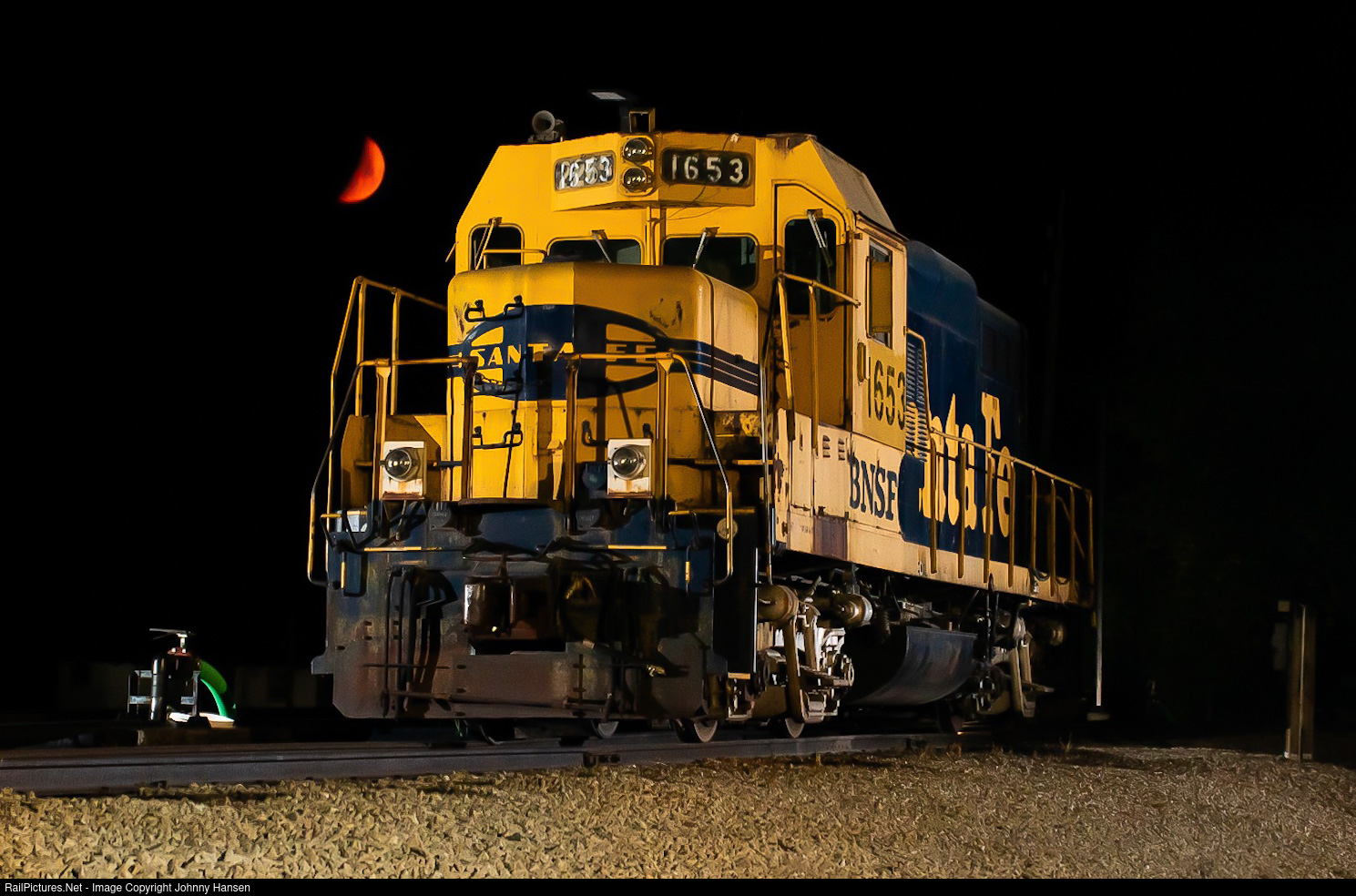 GP9u #1653, still wearing its Santa Fe paint, now serves as the Malden grain elevator switcher in Malden, Indiana. Seen here sitting under a red moon on a clear sky night.