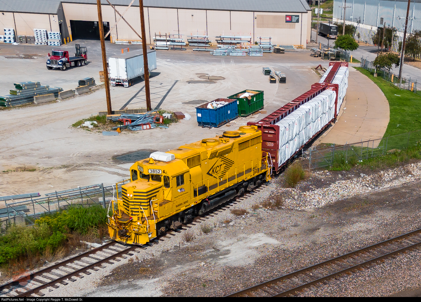 KCT/WAMX 3852 backs 2 loaded centerbeam cars in to L&W Supply