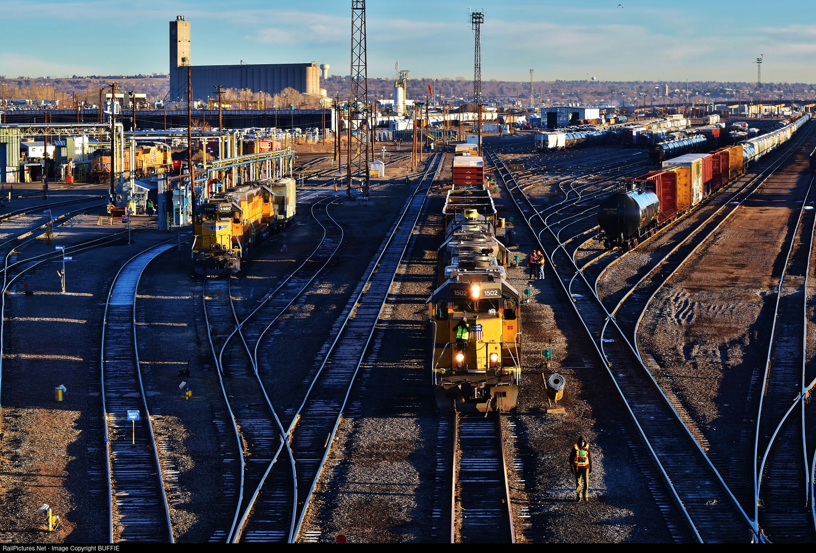 | Long shadows from a bright sunrise surround UP 1502 (GP40M-2) as it moves a cut of cars in the Union Pacific's North Yard in Denver, Coloradol