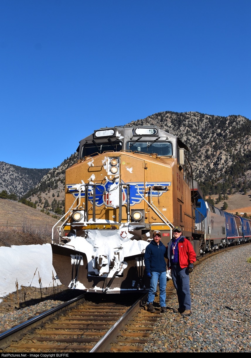 | Amtrak engineers Gary Meyer and Justin Anton pose in front of UP 5518 as they get ready to have a crew swap after bringing the California Zephyr down the Moffat Tunnel Sub. A Union Pacific motor was used when the consist lost a P42DC due to a bad wheel bearing. |