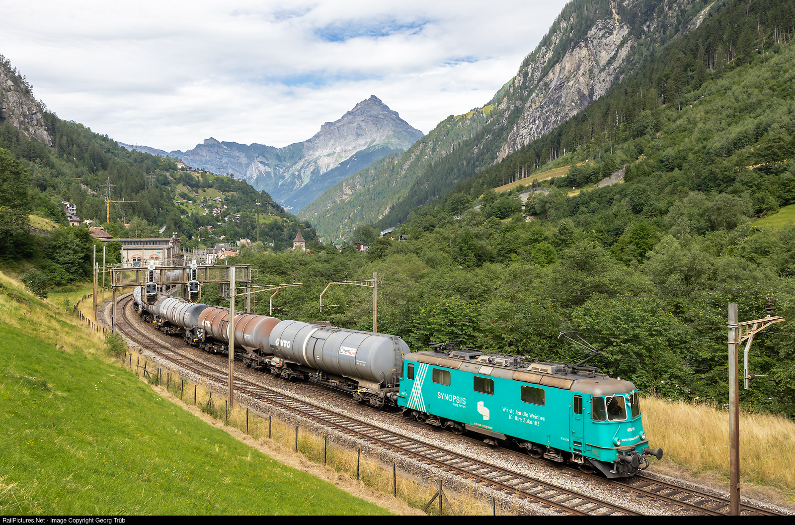 Freight train on the old Gotthard mountain line between Gurtnellen and Wassen, with the Chli Windgällen mountain in the background. Re 430 # 114 (former Re 4/4 III # 141 of the Vereinigte Huttwil Bahnen) of the Widmer Rail Services (WRS) in the Synopsis publicity paint scheme pulls train 69653 with empty tank cars from Birsfelden Hafen via Bözberg-Arth Goldau-Erstfeld-Göschenen-Bellinzona-Lugano to Chiasso shunting yard. The reason for this seldom view is the training of engineers on the Gotthard mountain line, which knowledge will be necessary in next january. Then, the Gotthard Base Tunnel (GBT) will be partly closed for maintenance works, all passenger trains will use the mountain line, including some occasional freights maybe.