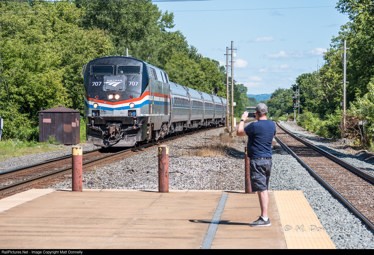 | An Amtrak Empire Service train arrives the station at Rome, NY as another railfan takes a photo |