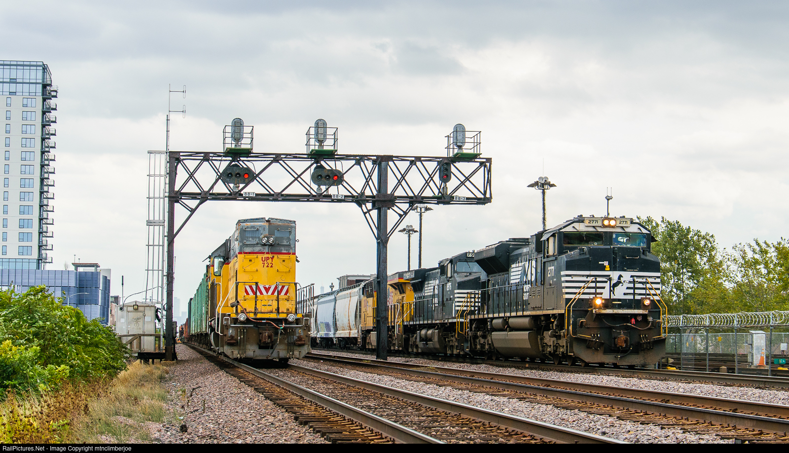 | A Norfolk Southern SD70M-2 leads a westbound manifest freight over the UP Geneva Subdivision as it rolls through River Forest, Illinois on its way to Proviso Yard. A Union Pacific GP15 slowly eases west on the adjacent track as it moves a work train and passes under the CNW signal bridge. |