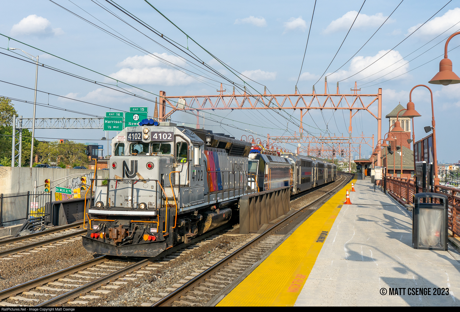 NJ Transit GP40PH-2 no. 4102 (EMD, 1968) is seen leading an equipment move consisting of an ALP-46 and four MultiLevel coaches through Newark Broad St Station, likely bound for Dover Yard. |