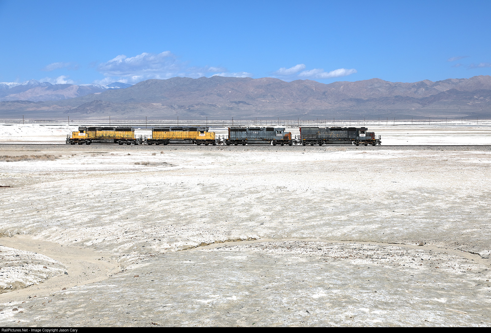 Electro Motive A vintage quartet of EMD power run towards Searles to pick up a coal train off the Union Pacific interchange. The power is moving along the edge of an ancient lakebed that is saturated with Trona. The mineral is used in various manufacturing process and is one of the main ingredients in making glass, detergent, Baking soda, and detergent. Rumor is the Trona may be shopping for new power, so these may be the last days for these hold-outs of the 70s, dressed for the 90s...