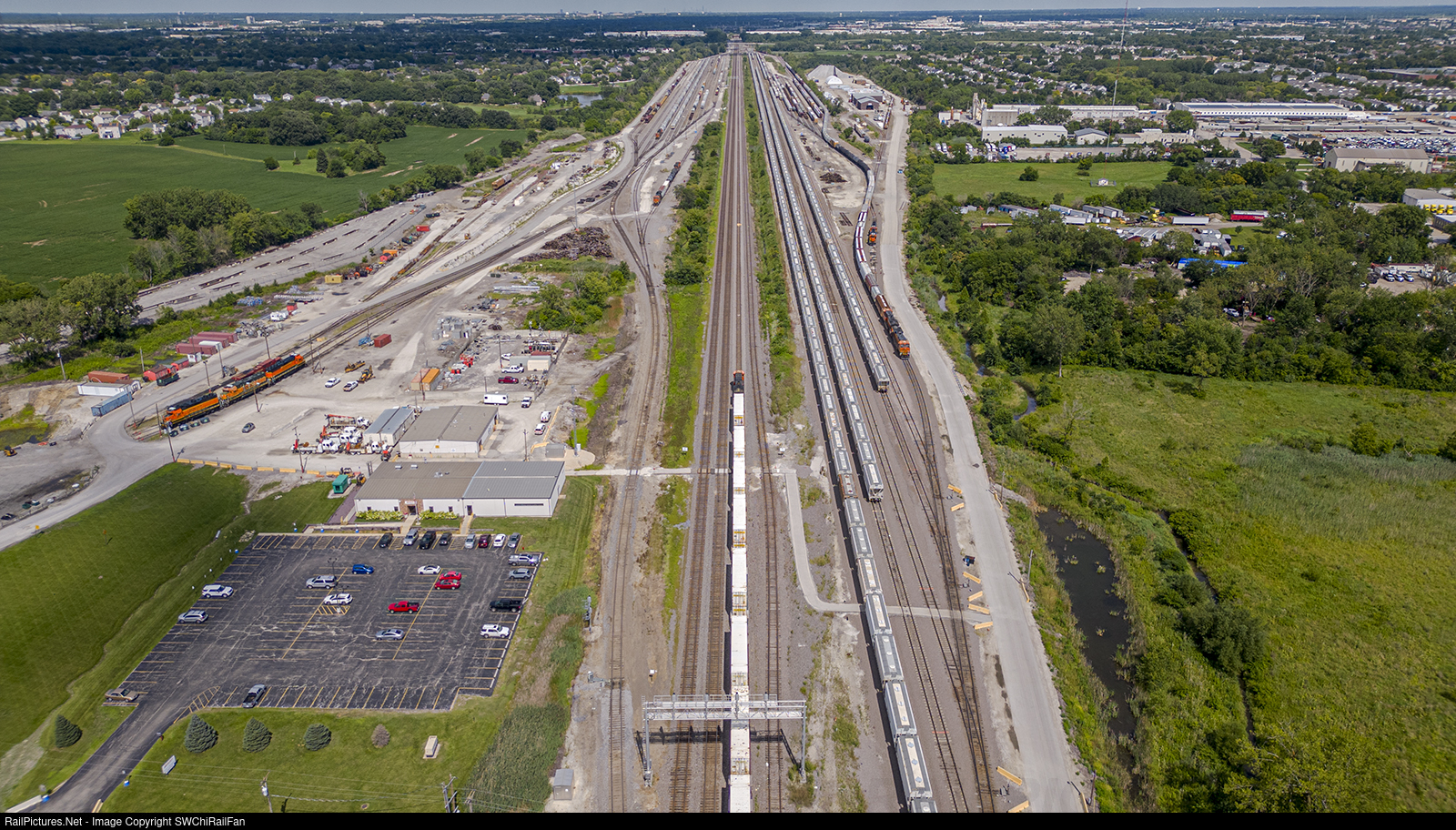 BNSF Eola Yard (McClure Road) looking east toward Chicago. Remnants of CB&Q roundhouse at left.