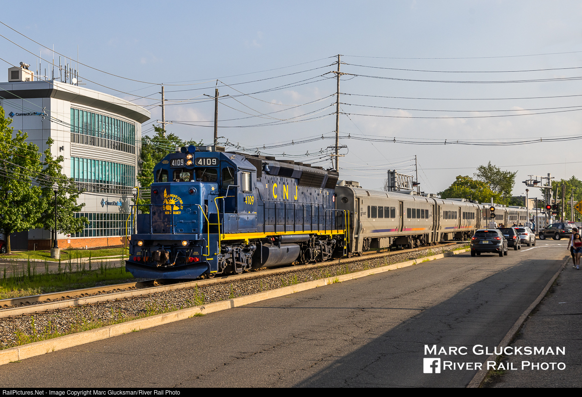 Mid-Street Runner. On Wednesday, July 26, 2023, NJ Transit GP40PH-2 4109 (née CNJ 3677, EMD, 10/1968) led Pascack Valley Line train 1631 as it departed the Essex Street Station in Hackensack New Jersey. The right of way here runs in between the directional lanes of the aptly name Railroad Avenue. NJTR 4109 was repainted into its as delivered 1968 paint scheme by NJT nearly four years ago in October, 2019, and can be seen in service on any of NJT’s diesel routes.