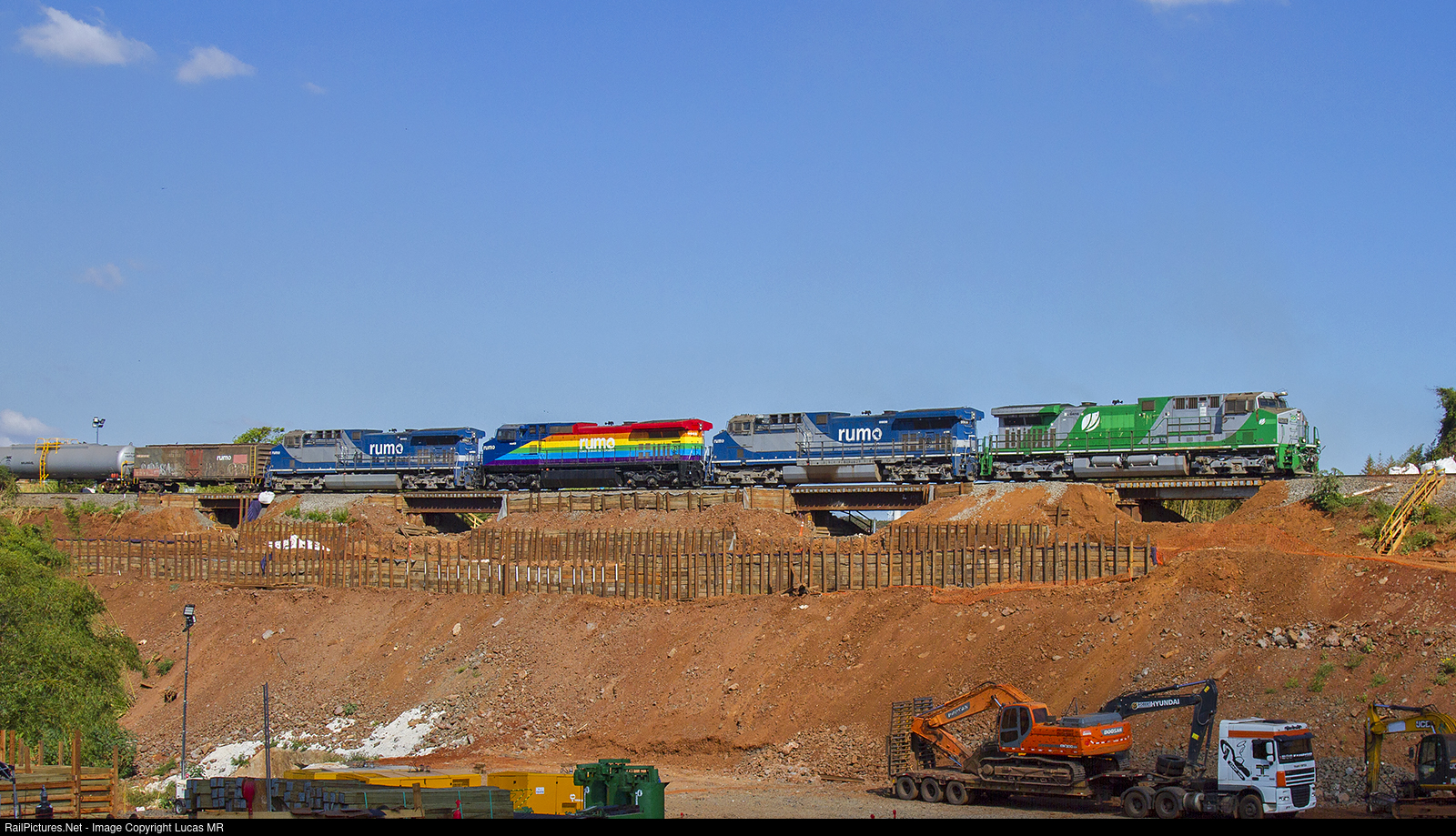 | Northbound T53 led by AC44i #8416 obeys a speed restriction on Km 208 due to track maintenance. A special guest is seen in this consist: The C44-9WM #9042, wearing the LGBT colors. |