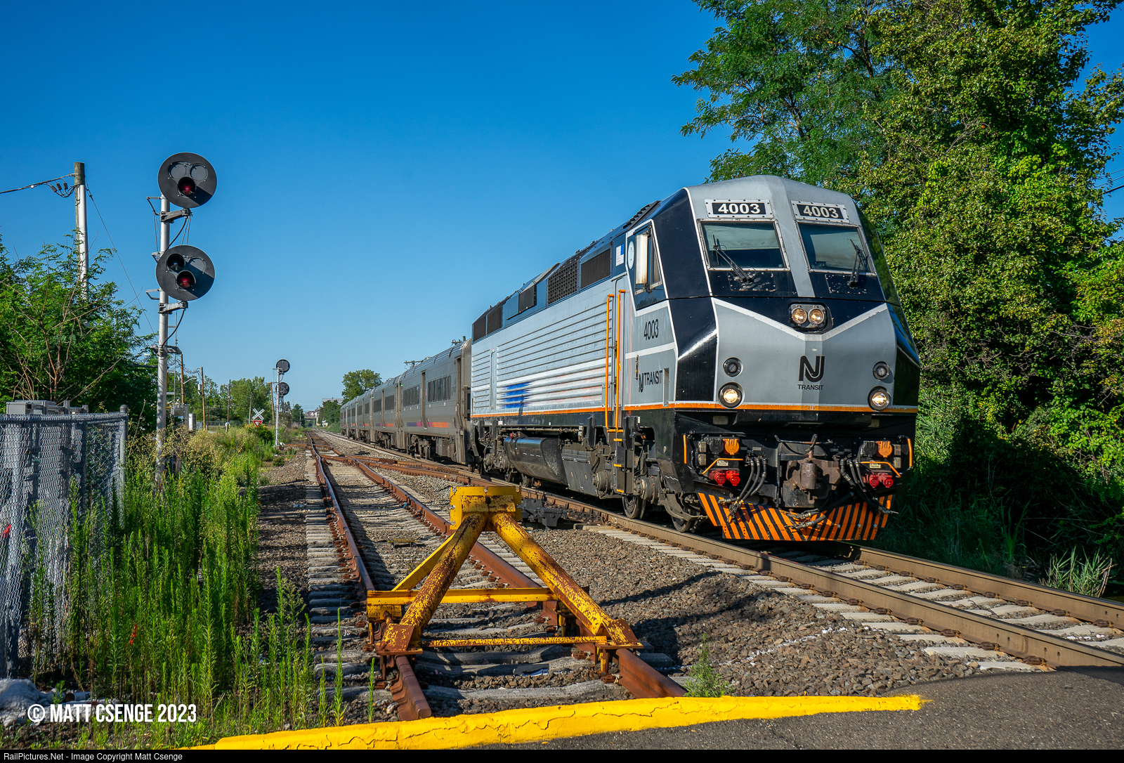 NJ Transit PL42AC no. 4003 is leading Pascack Valley Line train 2103 as it approaches the Anderson Ave grade crossing, passing what seems to be an unusably short controlled siding. |