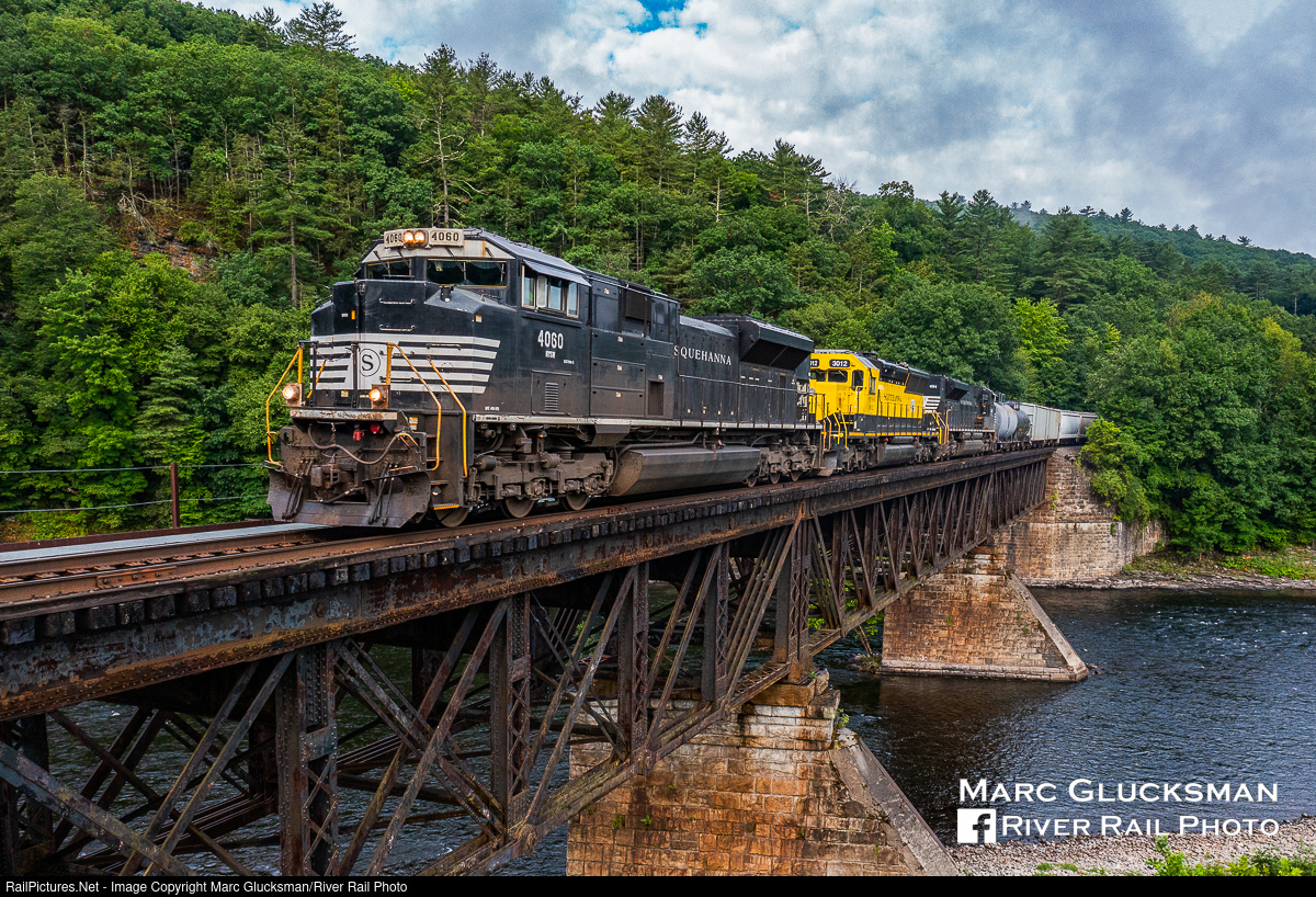 Crossing The Delaware In Daylight. New York, Susquehanna, and Western Railway SU-100 (NYSW 4060, ex-NS 2751, SD70M-2, 5/2006 leading) left Binghamton a few hours after its usual time, allowing for daylight on the morning of Monday, August 1, 2022, as the train crossed the Delaware River from Millrift, Pennsylvania to Sparrow Bush, New York. This former Erie/Erie Lackawanna Railroad line was once the route of the 100 and later NY-100, a priority freight from Chicago, Illinois to Croxton Yard, Jersey City, New Jersey.