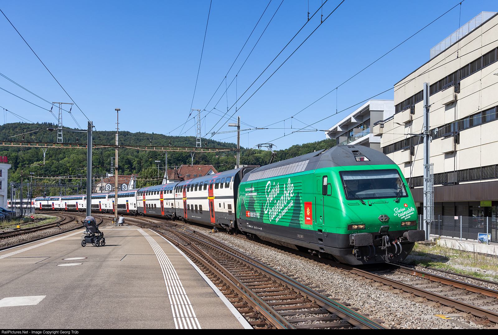 | Re 460 # 010 of the SBB in the "Swisstainable" paint scheme is entering Baden with the IR 2179 from Bern via Olten-Brugg to Zürich. |