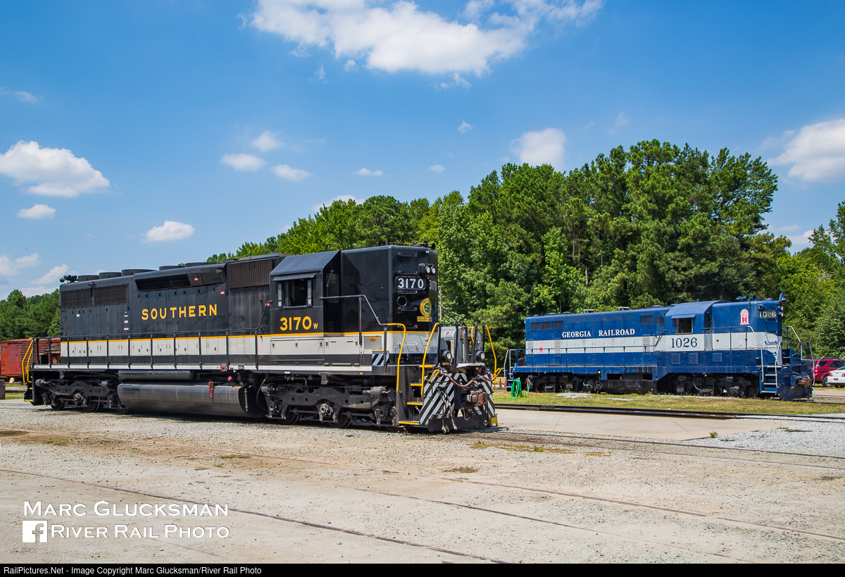 The Swapping High Hood Meet Up. It was an ironically odd pairing when Norfolk Southern SD40 3170 (née-Southern Railway/SOU 3170, 4/1971) was visiting the Southeastern Railway Museum (SRM/SMRX) in Duluth, Georgia on August 1, 2015 while still active on the NS roster and Georgia Railroad (GA) 1026 (GP7, EMD, 10/1950) was parked on an adjoining track. the GA railroad unit was briefly a resident of the Tennessee Valley Railroad Museum (TVRM) roster, but joined the SRM collection in 2006. NS 3170 was stored by NS in 2007, but in 2014 was repainted into the SOU paint scheme as part of its heritage program and started to work road trains, steam program specials and travel across the system to visit museums. It was subsequently retired and now lives at TVRM.