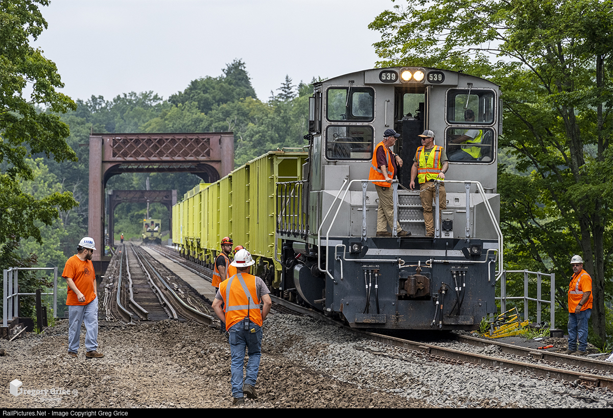 On the afternoon of July 29th, 2023, "glass out" Amtrak MP15DC 539, leads a loaded stone train over the Warehouse Point (Connecticut River) Railroad Bridge into Enfield, Connecticut on the MRS (Hartford) Line. This work train is the first train in decades to travel over the north side track of the bridge. The north side track was abandoned during the 80's as a cost cutting measure, but was recently rebuilt by Amtrak & the Connecticut Department of Transportation in efforts to completely re-double track the Hartford line. With traffic shifted to the north side, crews will be able to focus on refurbishing the south side.