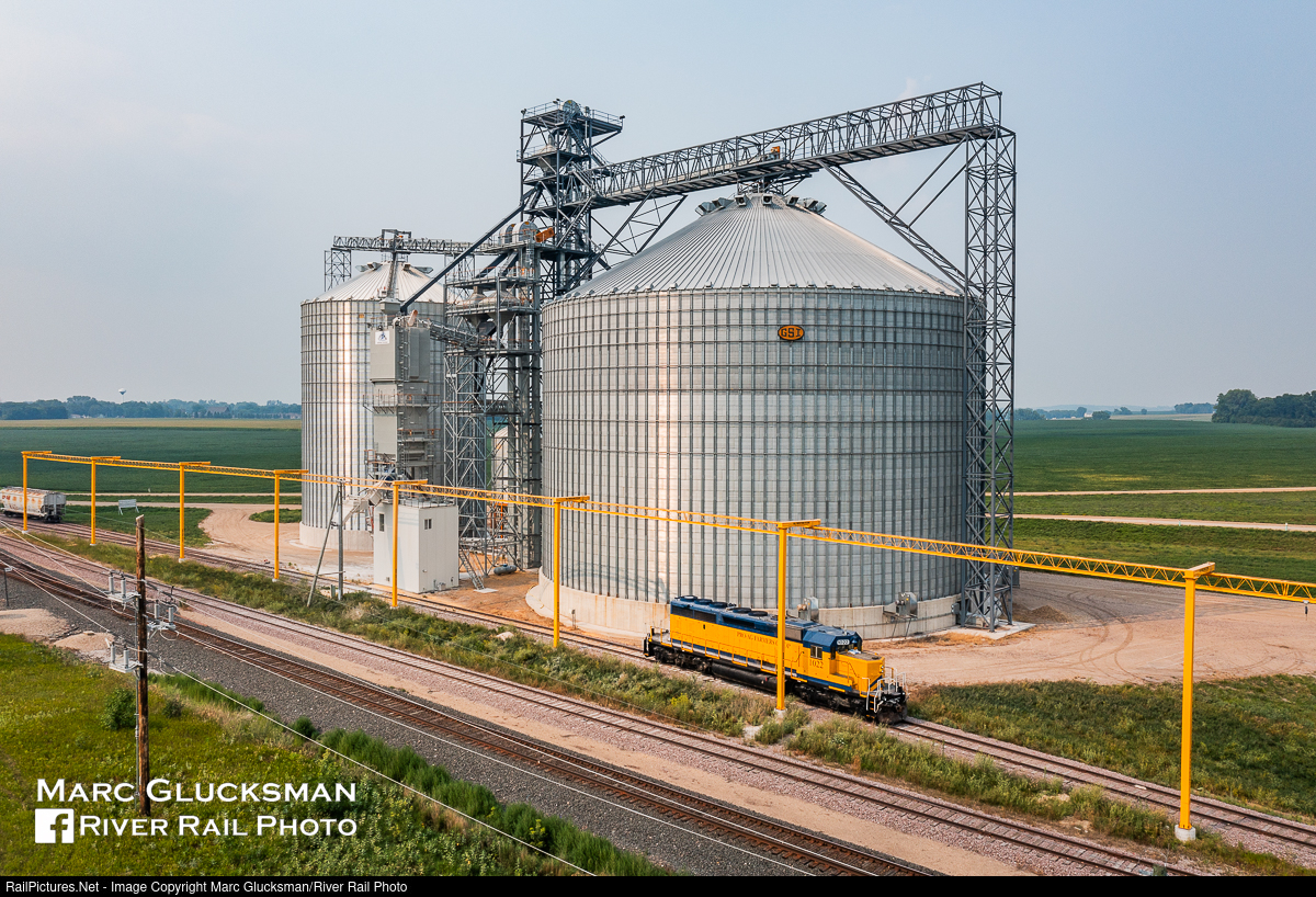 Pro-Ag. On the hazy and hot afternoon of August 1, 2021, Pro-Ag Farmers Co-op 1022 (ex-NPR 5558, née-CP 5701, SD40-2, 2/1975) sits next the silos at the Pro-Ag in Hoffman, Minnesota. This location, about a mile outside of the "in town" location of the other Pro-Ag grain elevator, is on the Canadian Pacific Elbow Lake Sub. It was owned by Hoffman Farmers Cooperative (until it merged with Pro-Ag) when it was built in 2013-2014 on Road T-175 with this 135-foot diameter 1.1-million-bushels GSI tank to facilitate rail service, which is still not available at the other site.