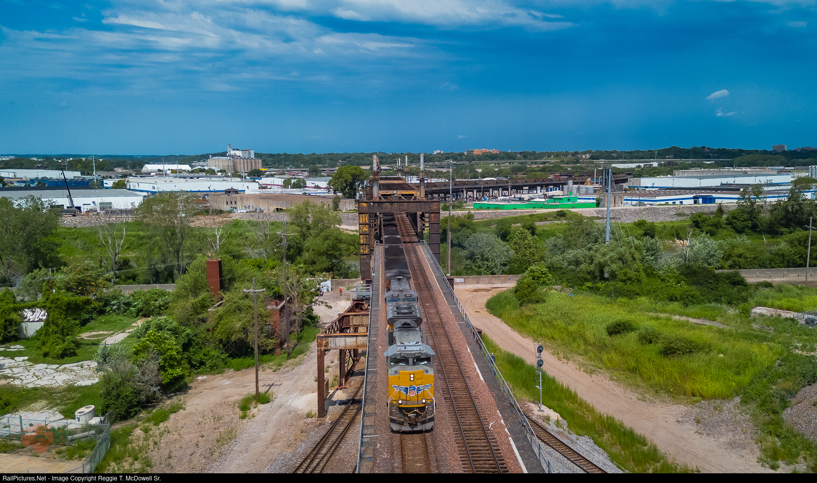 A UP coal train is seen, crossing the Kansas River and is slowing to prepare to diverge on to the BNSF Fort Scott Sub at CP 30th Street.