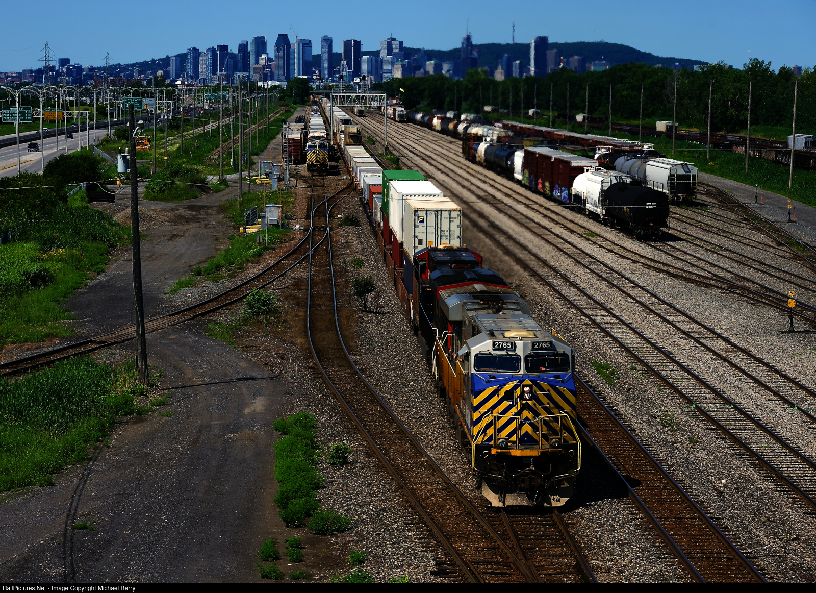 | Two units from the second batch of ex-CREX units that CN bought are in view as CN 120 with CN 2765 leading overtakes CN 322 with CN 2774 leading. CN 322 has just set off their train on the South Service Track and is waiting for CN 120 to pass before the power heads to the shops. |