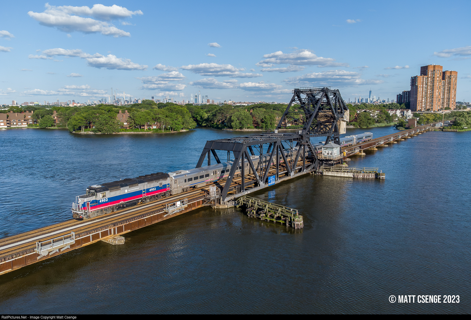 Metro-North Railroad GP40FH-2M no. 4902 (EMD, 1966-1970) is seen leading Bergen County Line train 1879 across HX Draw. Metro-North 208 may have taken the spotlight in its "beachball" heritage scheme, but these venerable units have been serving for decades in the same paint scheme just across the river. |