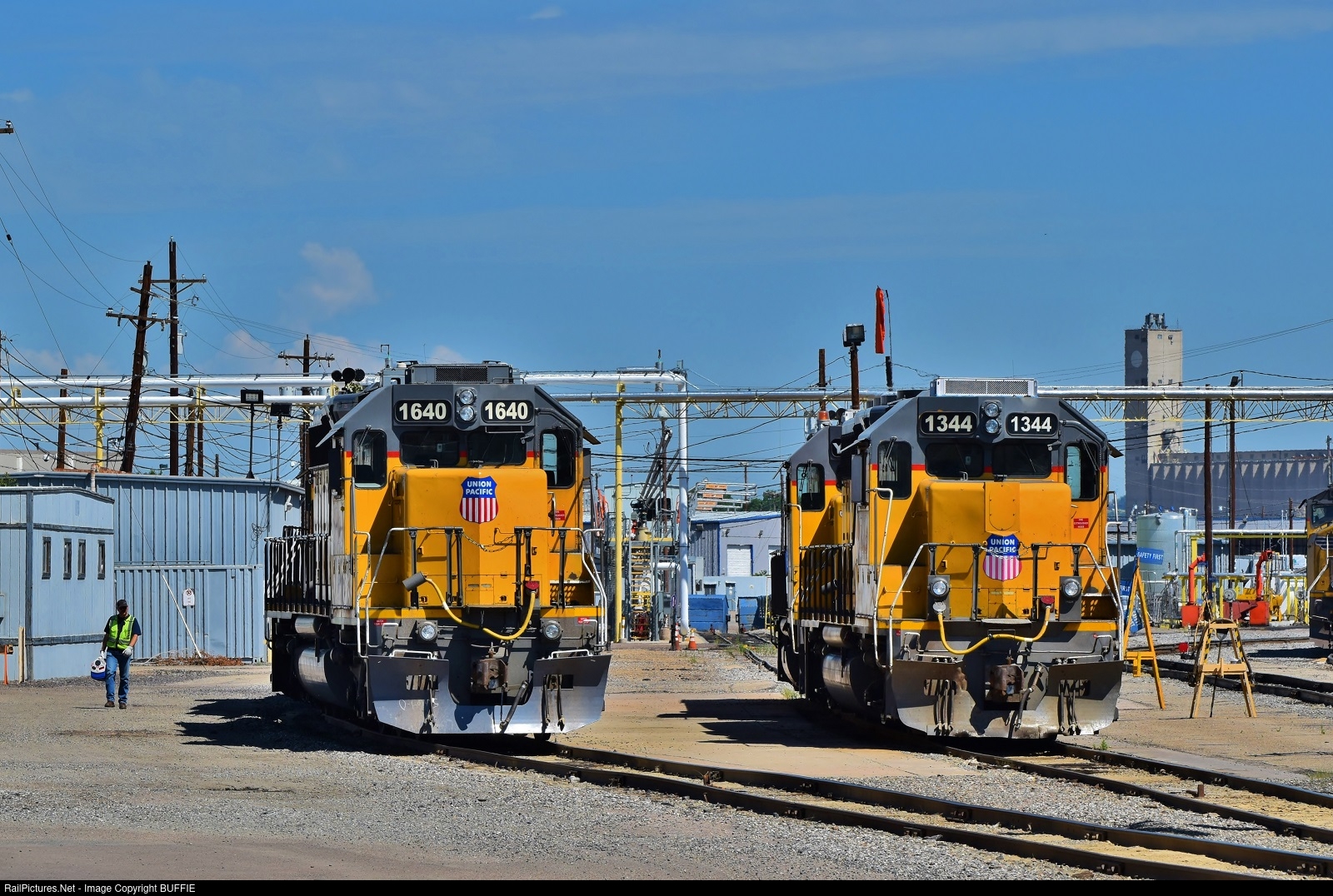 UP 1640 (SD40N) and UP 1344 (GP40-2) wait in the North Yard in Denver, Colorado for orders.