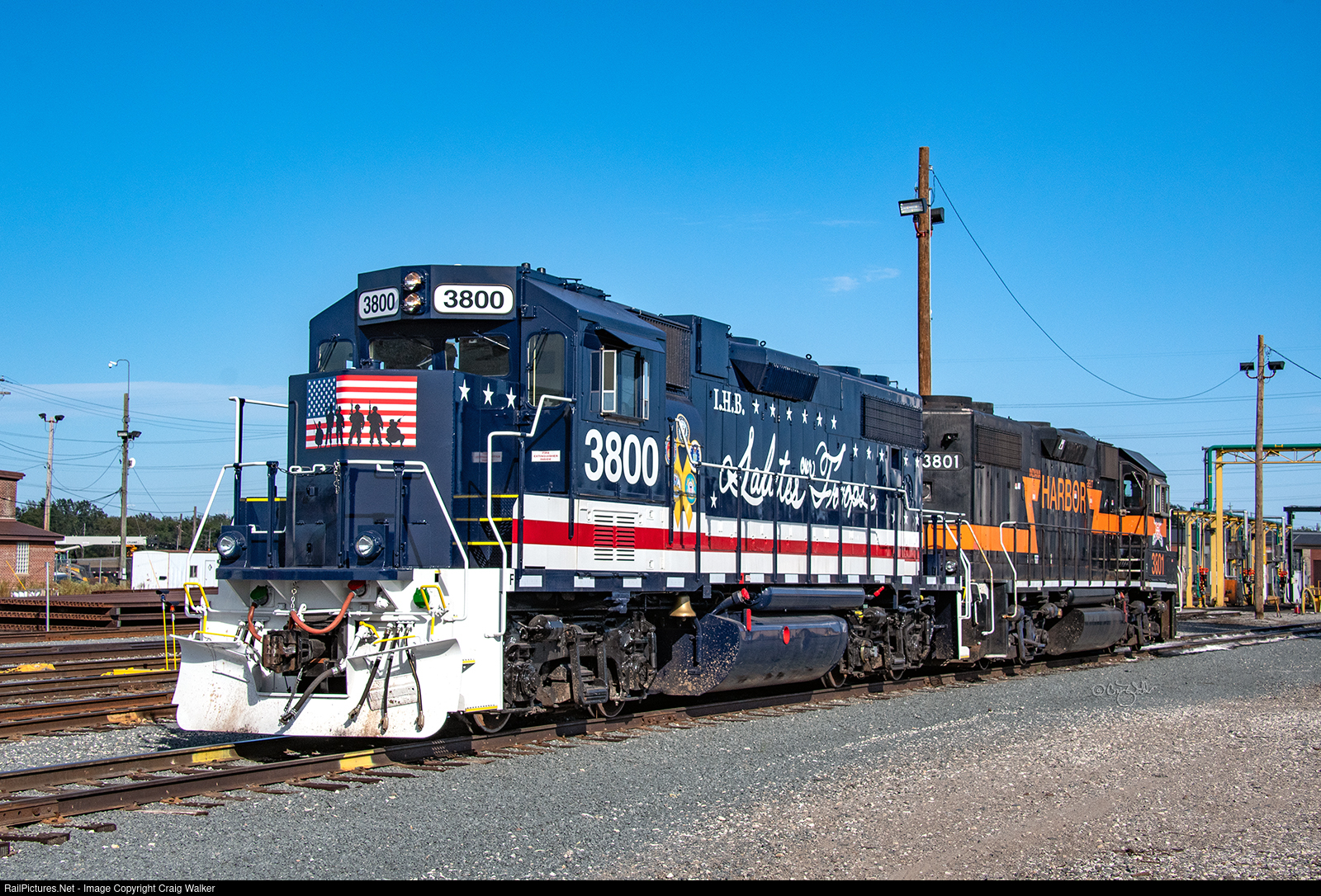 Indiana Harbor Belt GP38-2 3800 shows off its new-ish Veterans paint scheme at the railroad's Gibson Yard. This engine was built as Penn Central 8066, later becoming Conrail 8066, and then Norfolk Southern 5274 before being acquired by the IHB. IHB 3800 is coupled to GP38-2 3801 (ex-NS 5068, née-SOU 5068). (Hammond, Indiana - September 24, 2021). Photographed on railroad property with permission and full PPE and Covid precautions.
