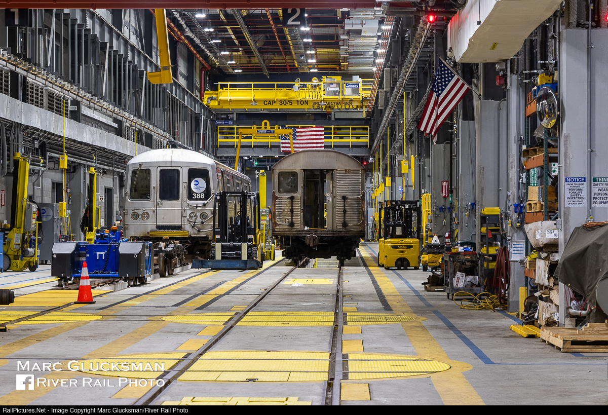 Staten Island Gets A Budd. In the early morning hours of July 27, 2023, MTA NYCT Subway's in house crew moved R-32 3389 (Budd, 1964) from the South Brooklyn Railway/NYNJ Rail interchange at the South Brooklyn Marine Terminal in Brooklyn, New York to the MTA Staten Island Railway (SIR), where the car will be used for work service. The passenger roster of SIR is comprised of 75 foot long R-44S/ME-2 and 12 ex-NYCT Subway R-44s (St. Louis Car Company, 1971-1973) cars that were "imported" after being retired from the subway and adapted to SIR service. The work fleet includes 2 cabooses (607 and 620) and RD422, an ex-IRT rider car (51'6"), thus making this the first 60'6" car on thee rails on the island. The new shop building at Clifton was opened in December 2022, a new home for the current fleet and the planned 75 car R-211S order when it arrives. Using the "front door" as intended, the car was brought directly into the shop. While making the turn from 1st Avenue to 39 Street, the driver and the tiller stopped to coordinate their move.
