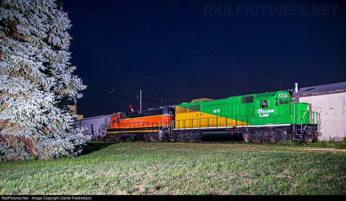 | Prairie Line GP40-2 #1670 sits with another unidentified Geep just south of the former C&NW depot on the far western end of the UP Geneva Sub, waiting for the next crew to take the duo to work Clinton's ADM plant. |