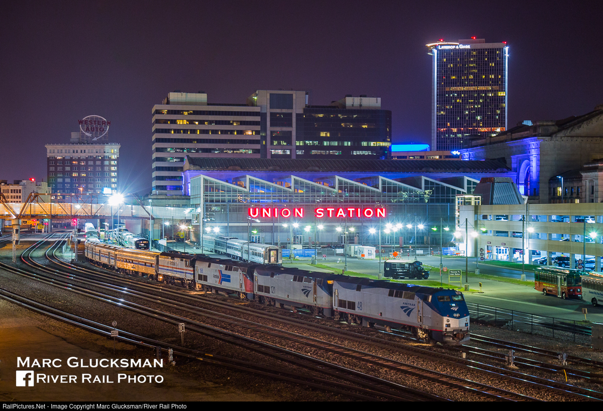 Night In KCY. The Amtrak Southwest Chief (Train #3) arrived on the evening of August 3, 2016 with an even larger consist than usual. With the Amtrak Exhibit Train on its way to Pueblo, Colorado on what was the last round of public trips, it was spliced directly into the consist. Led by P42s 48 and 121 (Phase V), P42 156 (Phase I) was chosen to power the Exhibit Train when it will ultimately split off on its own and is followed by F-40 NPCU 406 (Phase III). In the background AMTK 822 (P40DC) sits at the head of the Amtrak Southwest Chief Inspection Train, which will depart the next day, while KCS 34 (FP9A) sits on stationary display with the famous "Western Auto" sign overlooking the scene. With its illuminated letters, the magnificently restored Union Station Kansas City in Kansas City, Missouri provides the backdrop