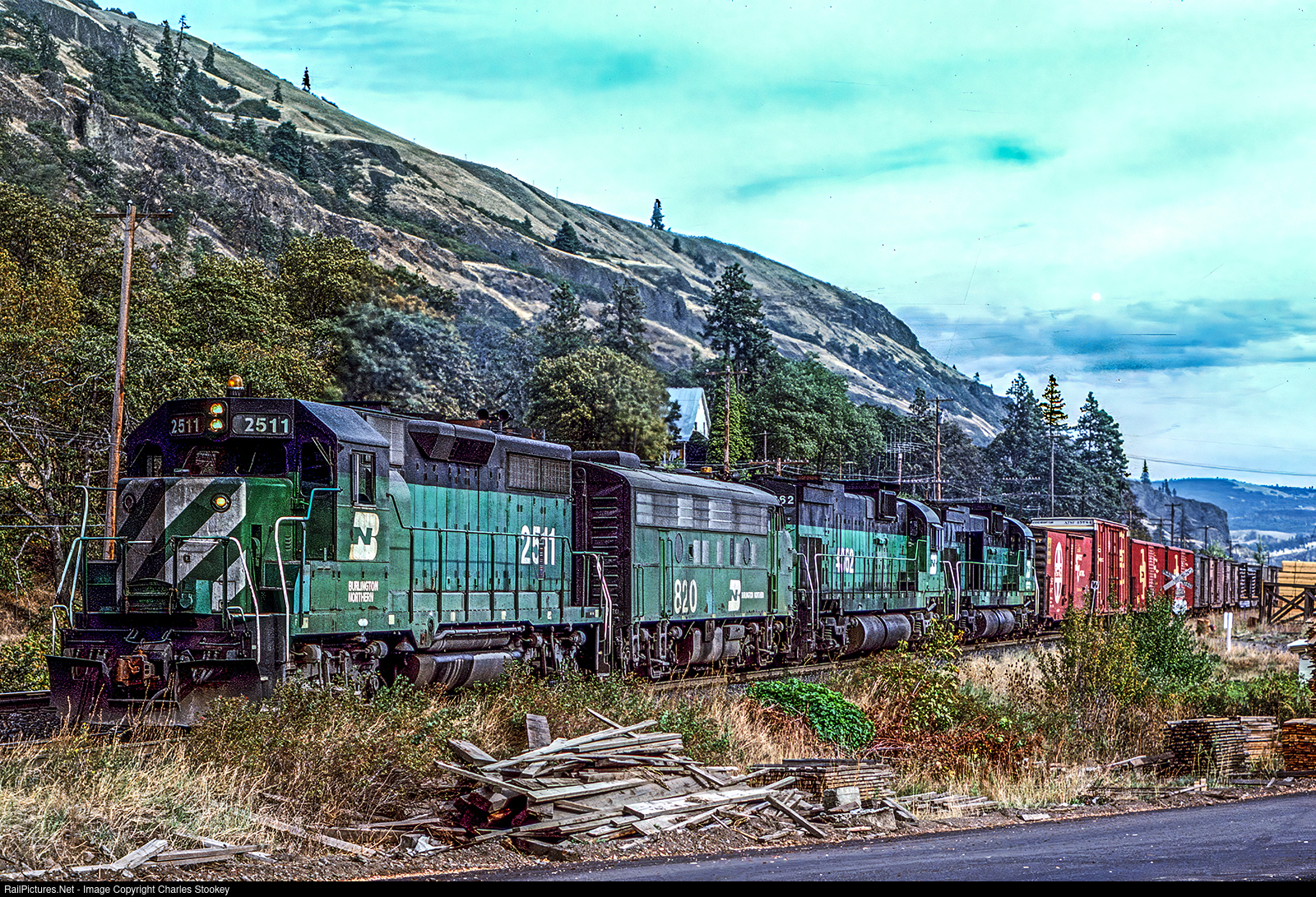 BINGEN WA Sept 27 1978 — Burlington Northern GP35 2511 leads a mixed freight west on the Fallbridge Sub. Rolling trains were rare as this was in the middle of a nationwide railroad strike. My photo.