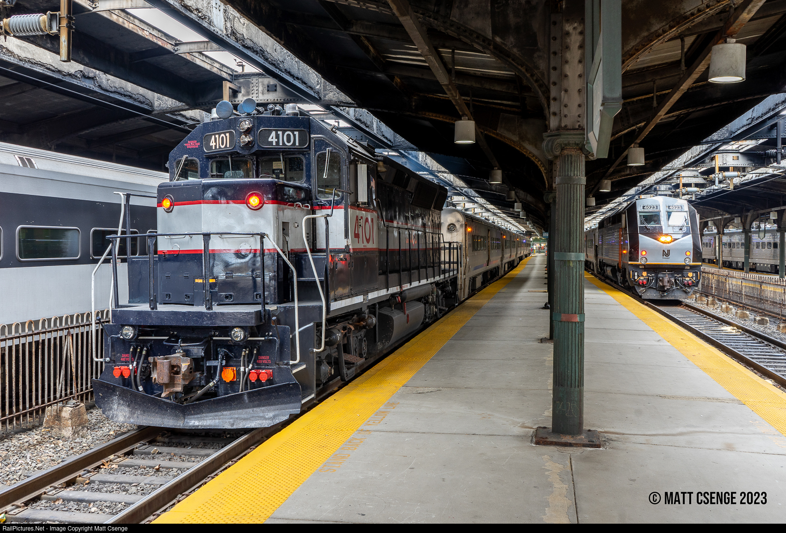 NJ Transit GP40PH-2 no. 4101 (nee Central Railroad of New Jersey; EMD, 1968) and PL42AC no. 4023 (Alstom, 2005-2006) are seen idling on tracks 11 and 12 at Hoboken Terminal. 4101 would lead Morristown Line train 881 to Hackettstown and 4023 would lead Montclair-Boonton Line train 1009 to Dover. |