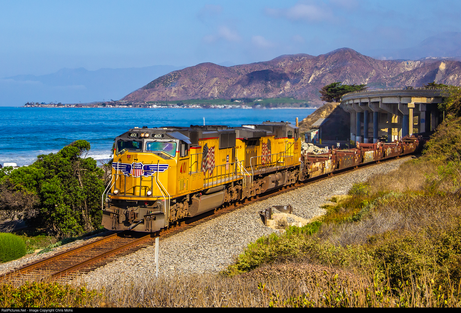 | Rolling under the Pacific Coast Highway Bridge into Emma Wood State Park, Union Pacific SD70M 4101 leads leads empty wells southbound to Los Angeles. |