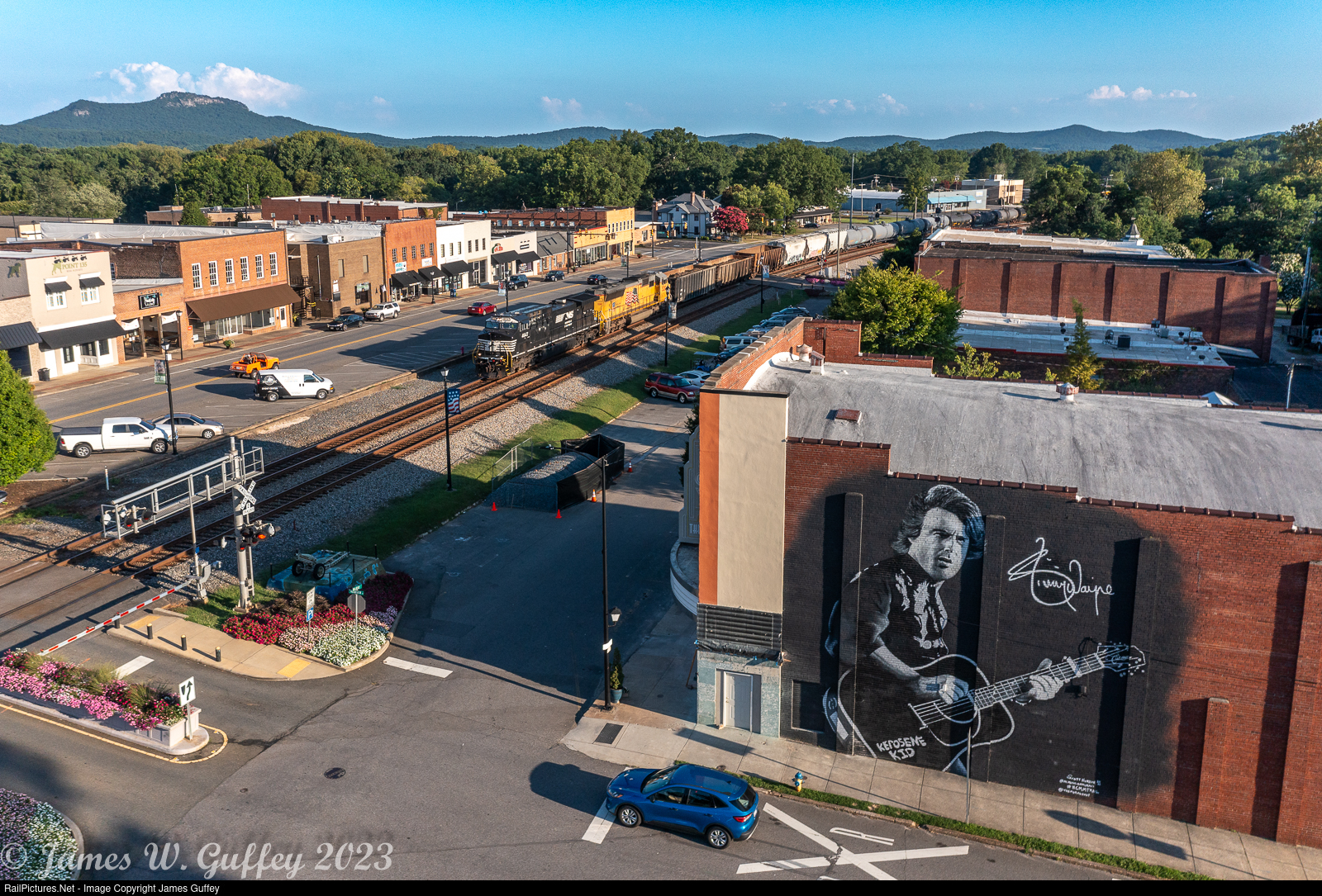 154 rolls north past the Joy theater in downtown Kings Mountain. The mural is of locally-raised country music artist Jimmie Wayne.