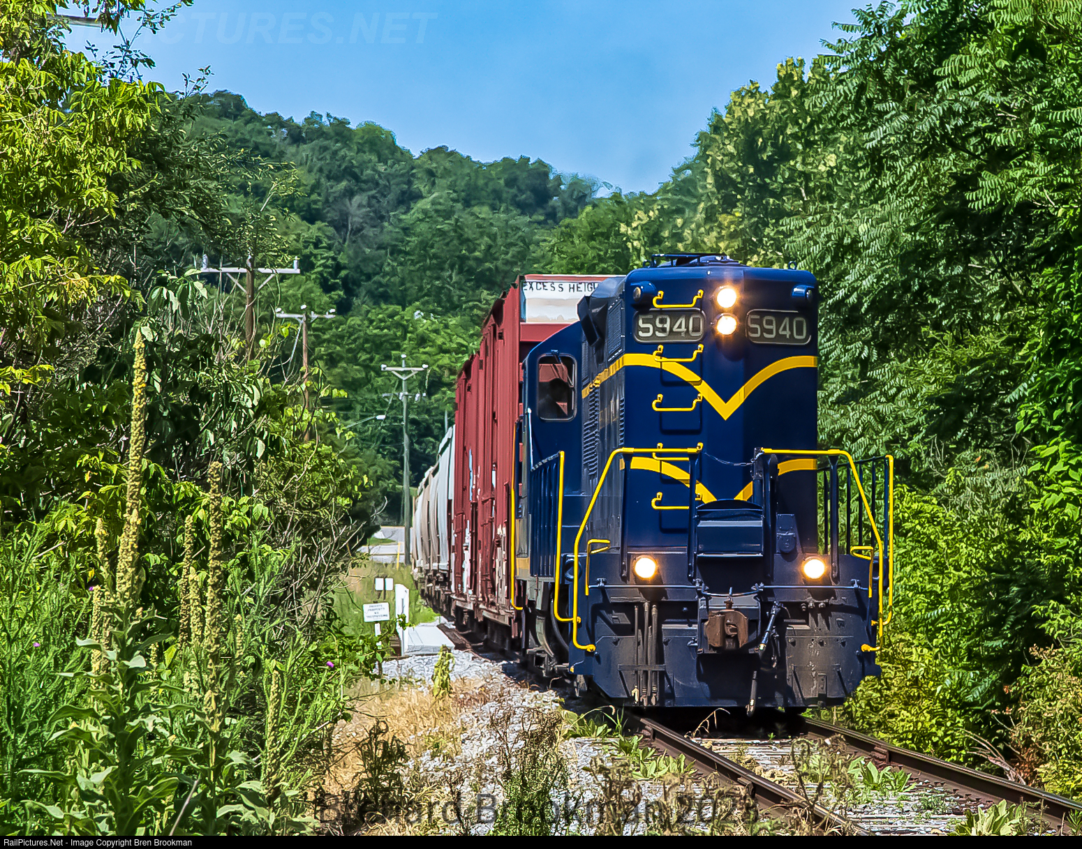 Shenandoah Valley Railroad local operated by the Durbin Greenbrier Valley Railroad with the DGVR 5940 sporting the colors of the original C&O livery. The local running long hood foward climbs a short grade as they return to back their yard just about half mile or so away, before they return they'll stop just before entering the yard to set their cars in tow into the Valley Feed spur track in preparation for Buckingham Branch Railroad to come in the next morning and pick them up.
