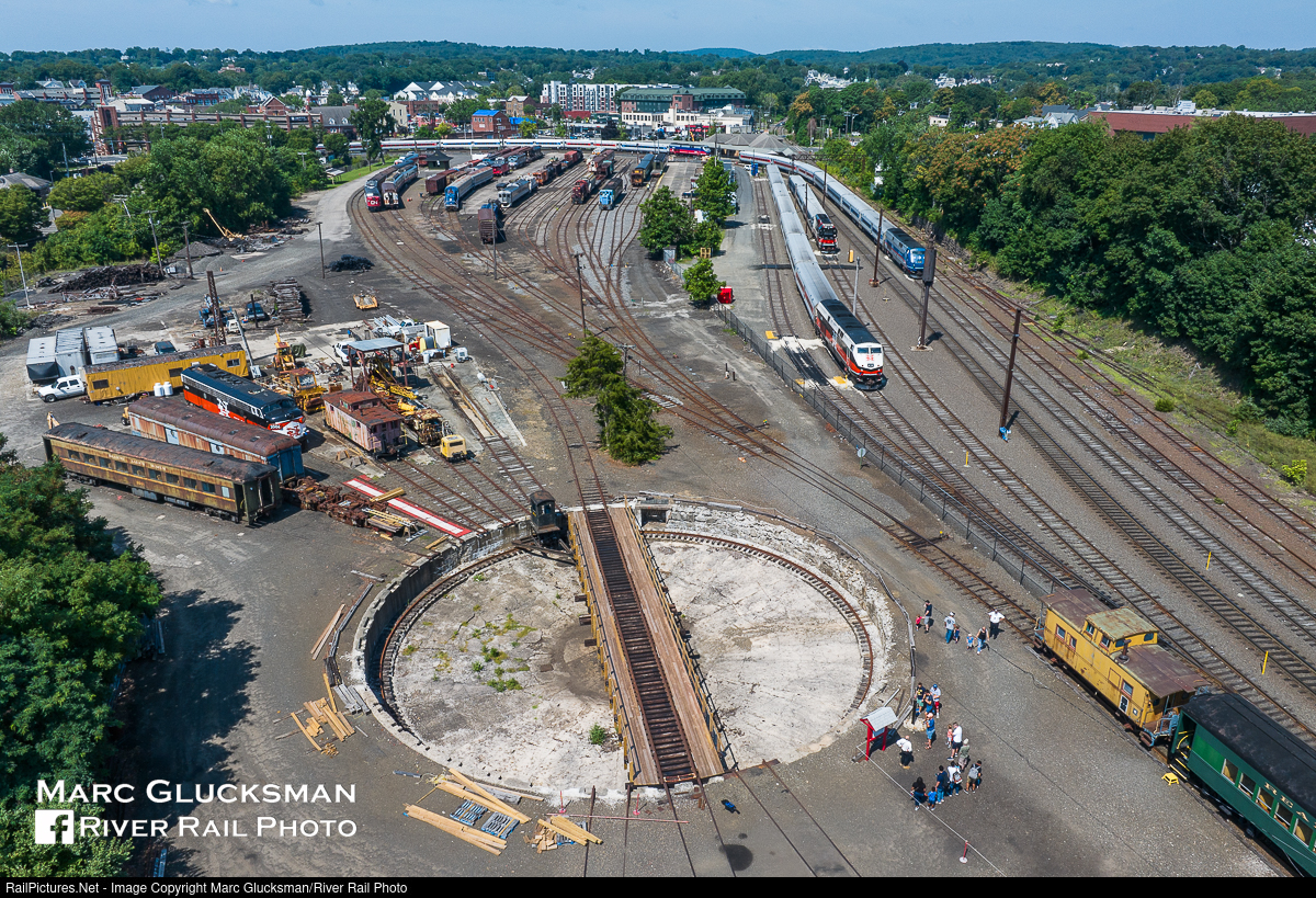 An overhead view of the Danbury Railway Museum in Danbury, Connecticut on Saturday, August 5, 2023 shows both its extensive collection as well as its proximity to MTA Metro-North Railroad.