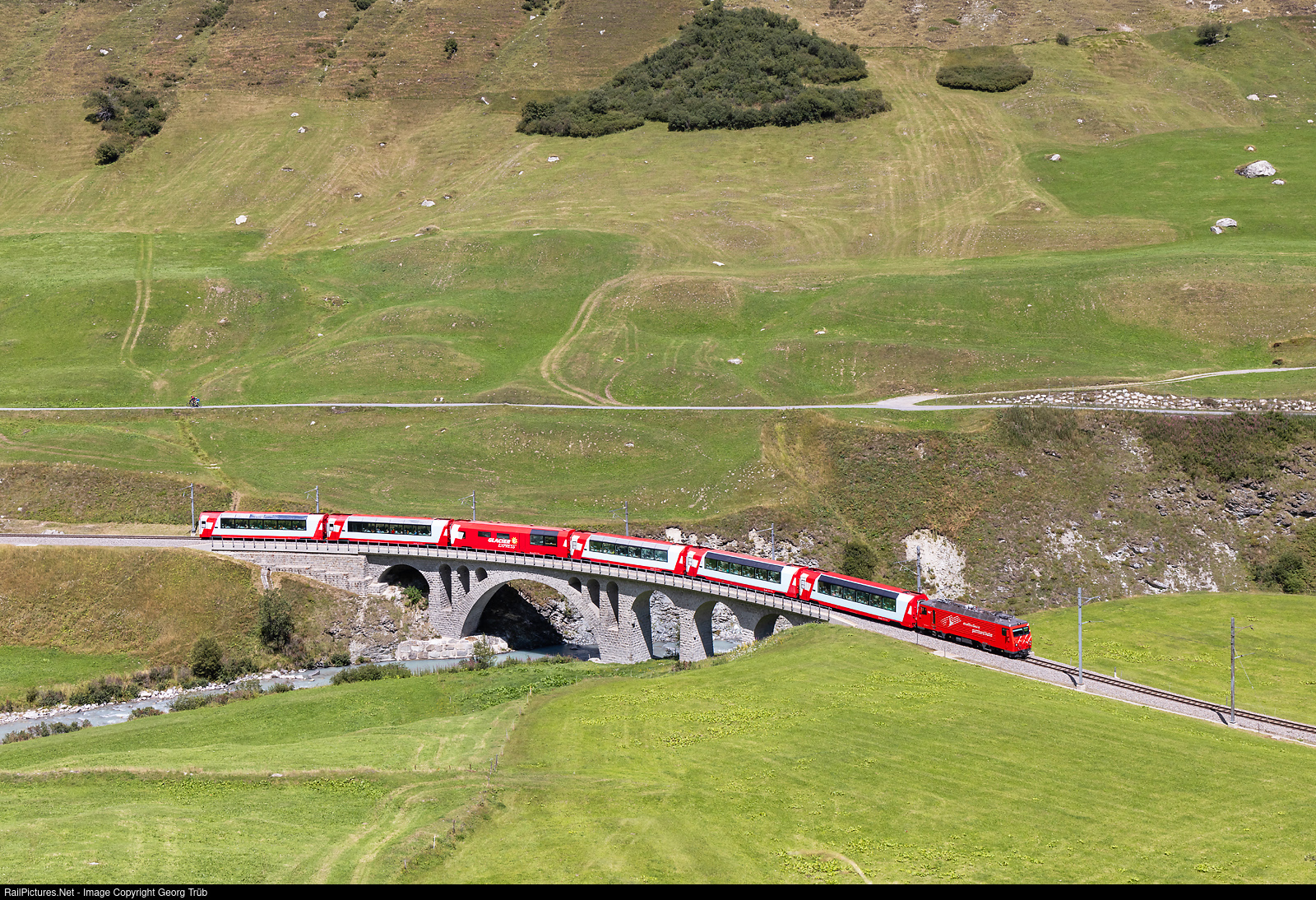 Cogwheel locomotive HGe 4/4 II # 108 of the Matterhorn-Gotthard-Bahn is pulling the PE 904 GLACIER EXPRESS from Zermatt to St.Moritz over the 70 meter long Richleren viaduct between Realp and Hospental.