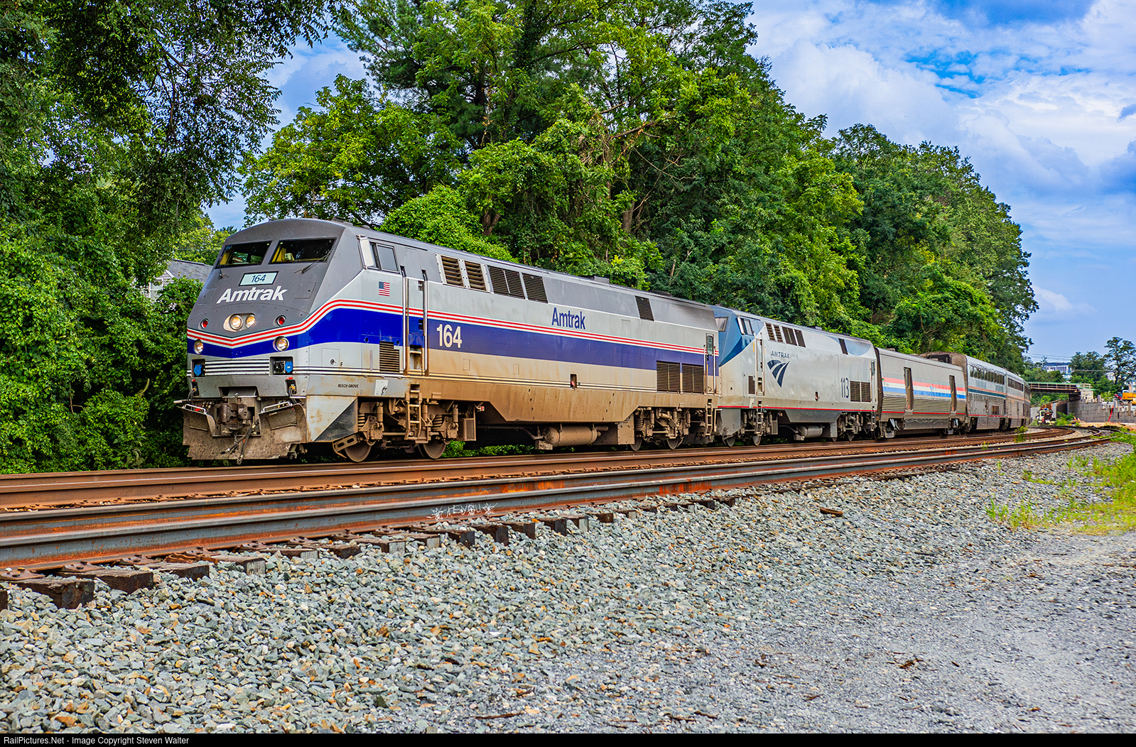 Amtrak's Phase IV Heritage Unit #164 bypasses the fairly new Georgetown I.T. track. This siding was re-laid parallel to the mainline in order to make room for the Maryland Department of Transportation Purple Line Project. Construction can be seen to the right of the train.