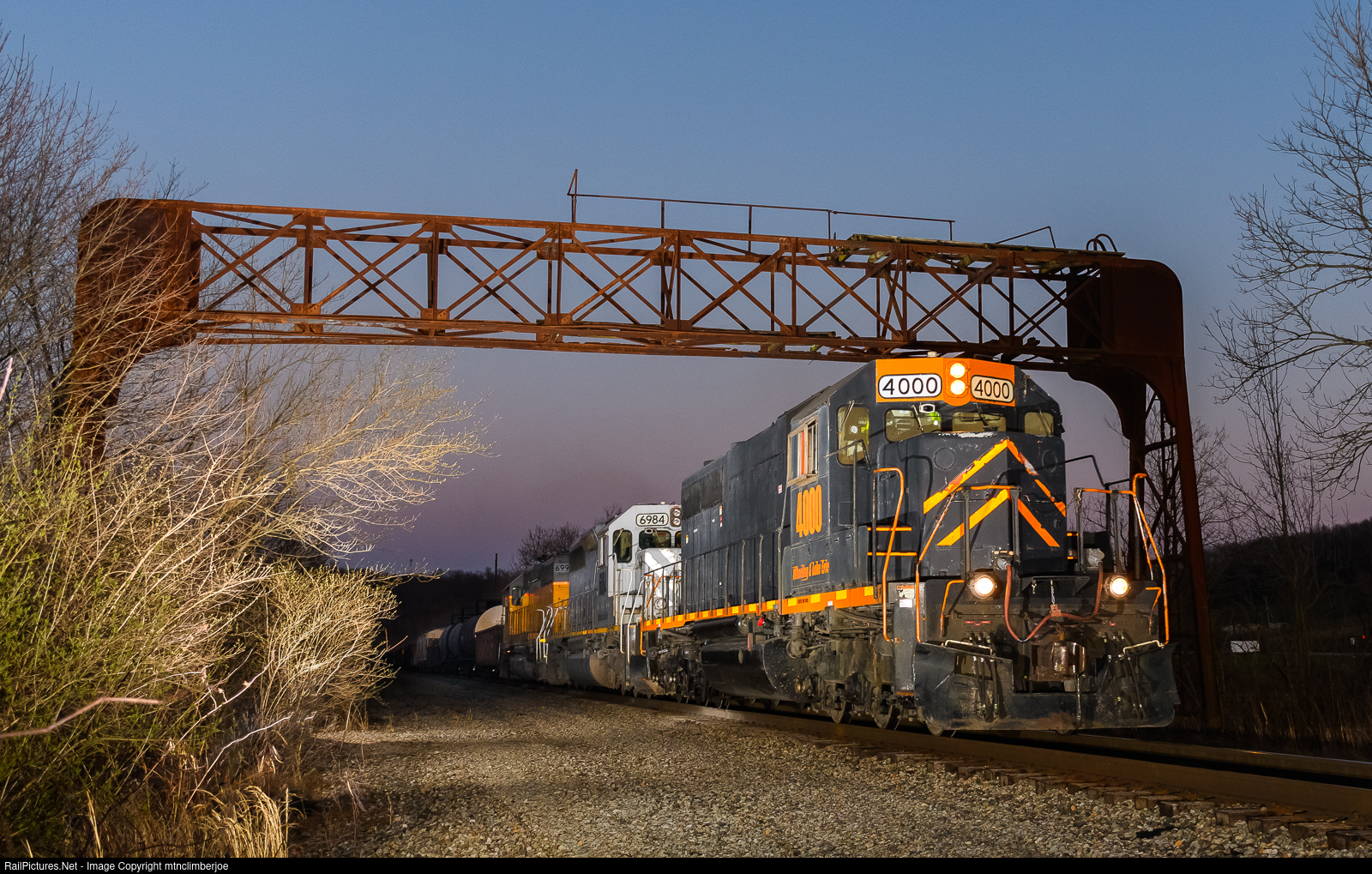 | Shortly after sunset, a trio of Wheeling & Lake Erie SD40's break the silence in Jewett, Ohio as they roll underneath a former PRR signal bridge. This WLE train is currently running on Ohio Central's CUOH Pan Subdivision using shared trackage between Jewett and Bowerstown. The train normally runs across WLE trackage between Mingo Junction and Jewett, but today ran over the CUOH Pan Subdivision to detour due to track work on the connection to the yard at Mingo Junction. |