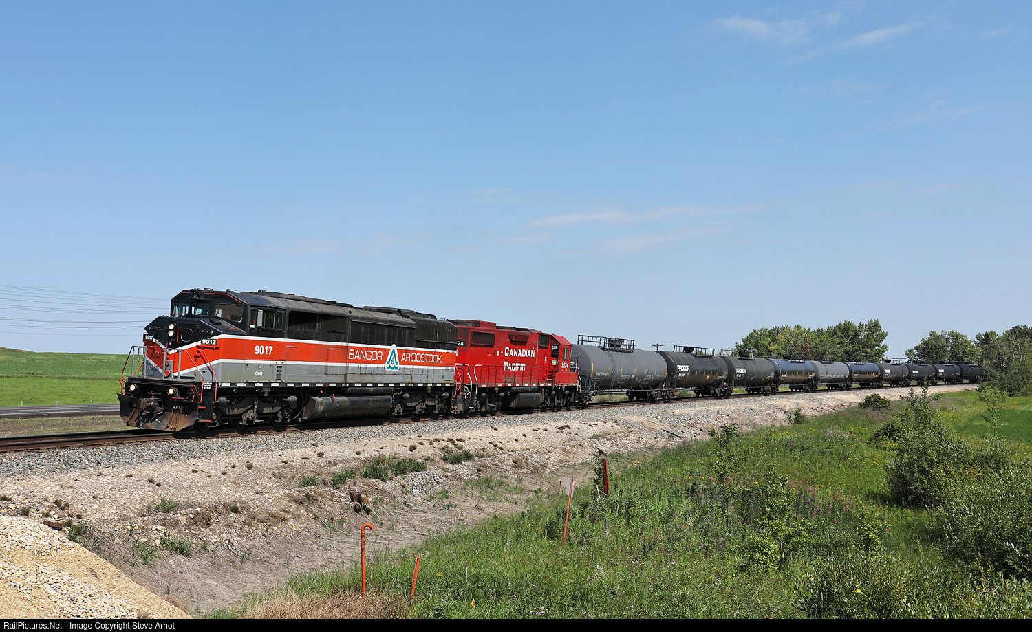 CMQ's Bangor & Aroostook heritage SD40-2F 9017 and GP38-2 3024 approach Blackfalds as they head south on the Leduc Sub.