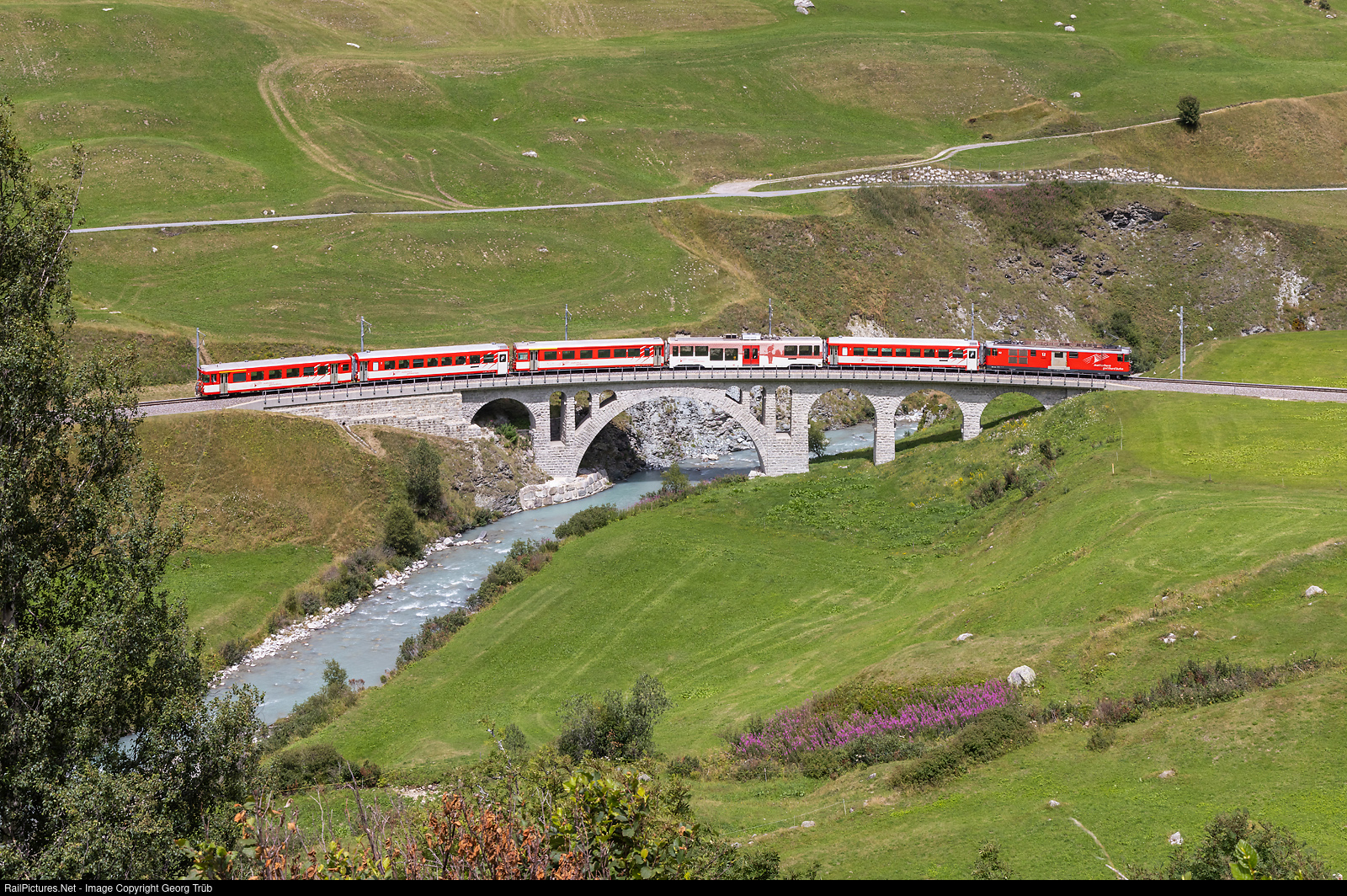| Cogwheel railcar with baggage compartment Deh 4/4 # 52 "Tujetsch/Sedrun" of the Matterhorn-Gotthard-Bahn is shoving the regional train R 549 from Andermatt to Visp over the 70 meter long Richleren viaduct between Hospental and Realp. The push-pull train is reinforced with a modul of B and ABt. The railcar was built in 1972 by SLM, SIG and BBC for the Furka-Oberalp-Bahn in a series of 5. |