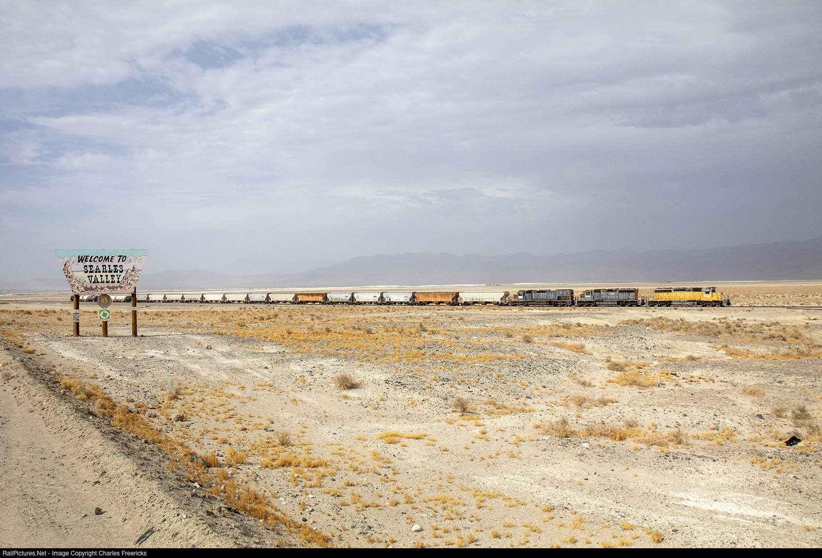 The Trona Railway heads south past the Searles Valley welcome sign outside of Trona.