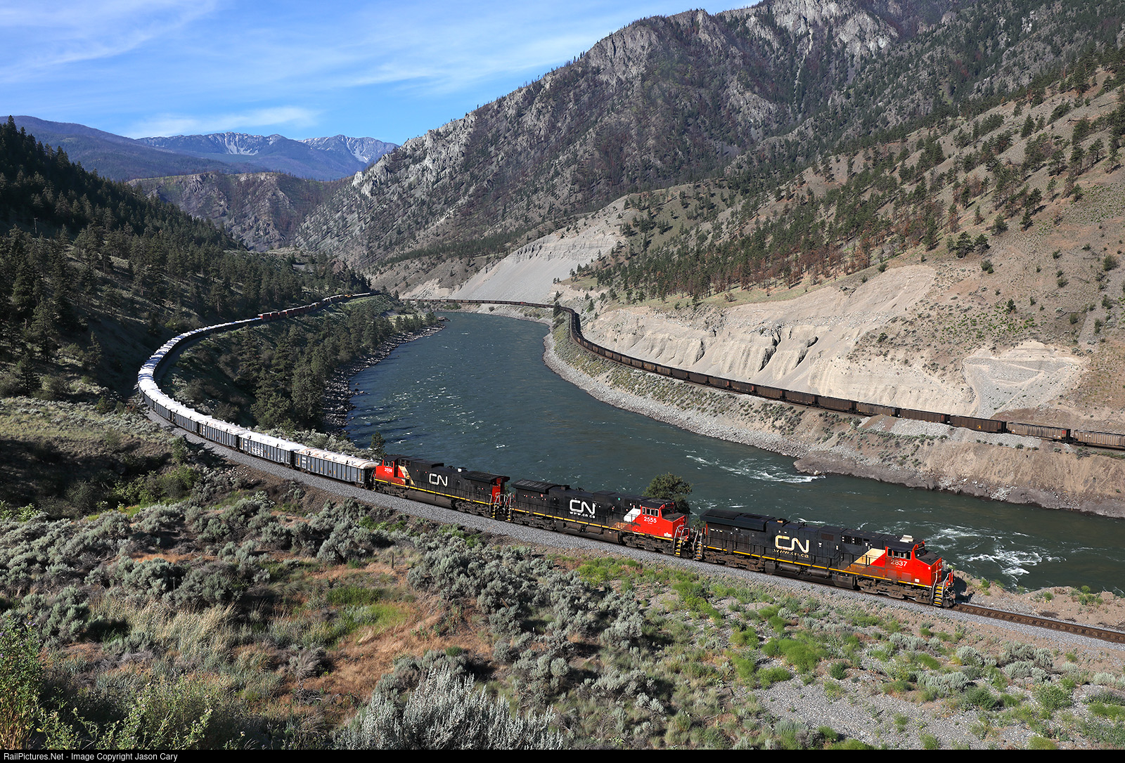 Thompson Canyon Grade An early morning manifest originating in Vancouver blast up heavy grade in the Thompson Canyon. The grade here is about 1.2% and will be one of the steepest sections of railroad this trains on the CN encounter between Vancouver and Edmonton. The train riding on CPKC rail. CPKC trains will encounter much steeper grades east when the encounter the Selkirk's and the Rockies .
