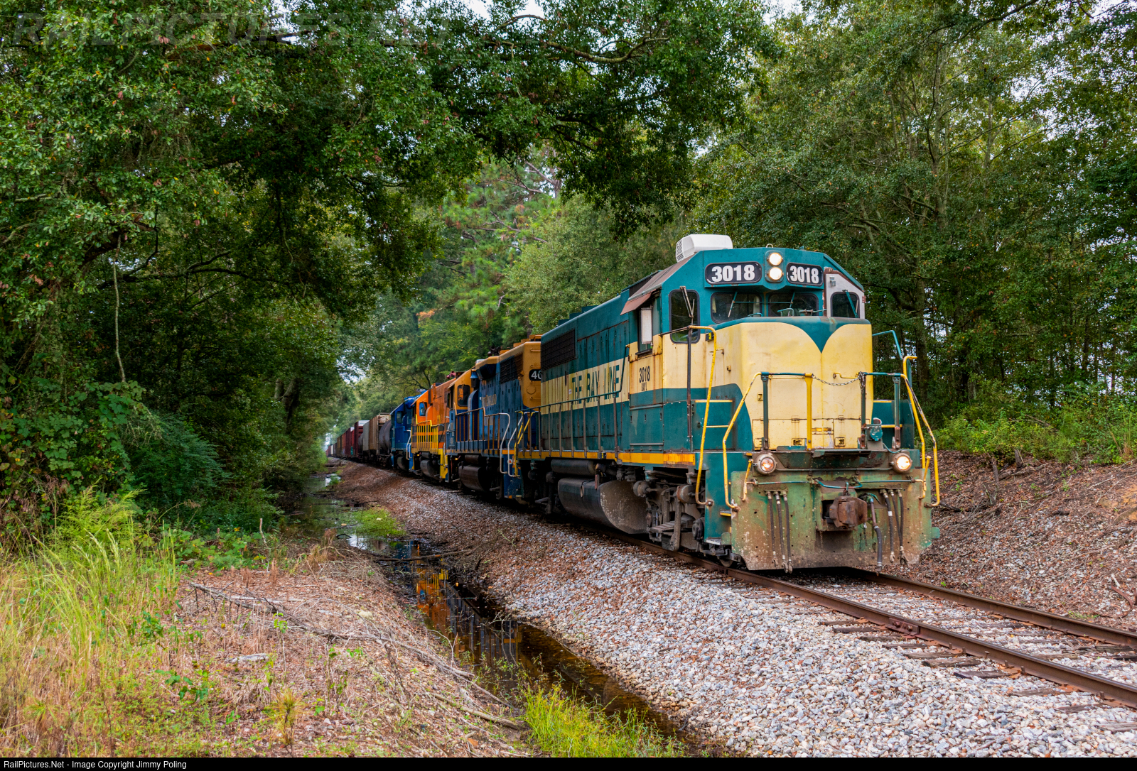 | One of only a handful of Bay Line painted locomotives, GP40-2 3018, leads the Hilton Turn eastbound at Jimbo Road outside of Dothan, AL. |