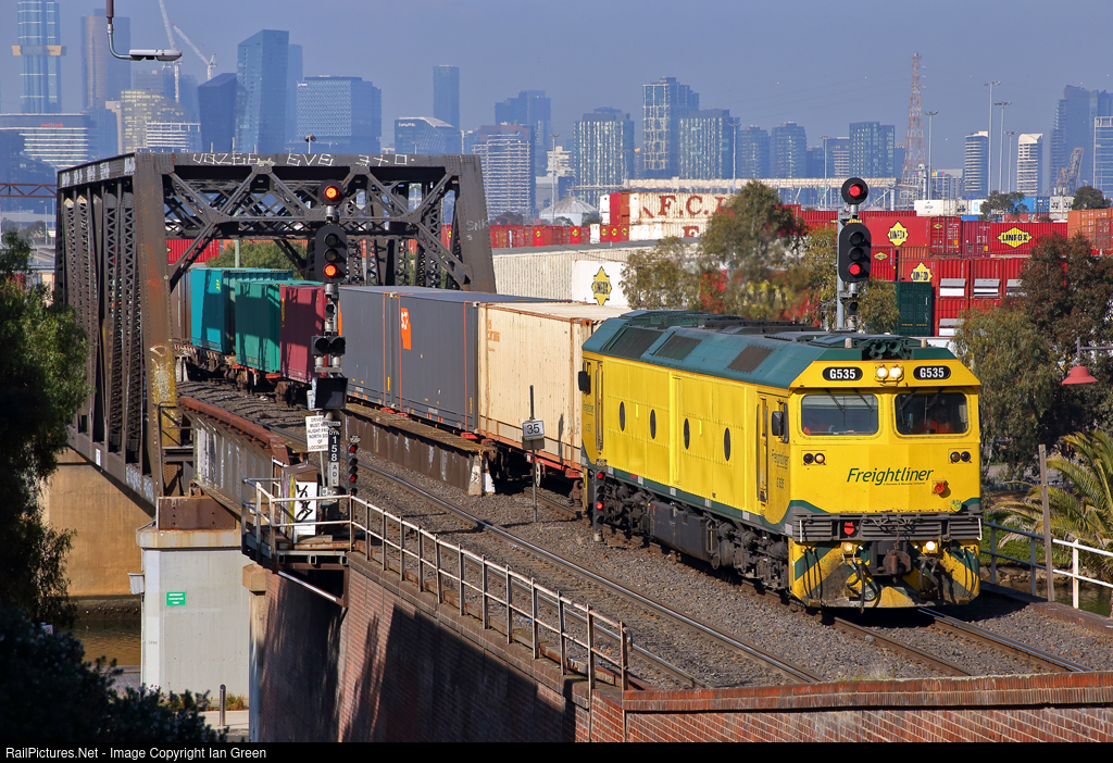 | G535 with 3MP1 Aurizon freight to Perth approaches Bunbury Street, Footscray. |