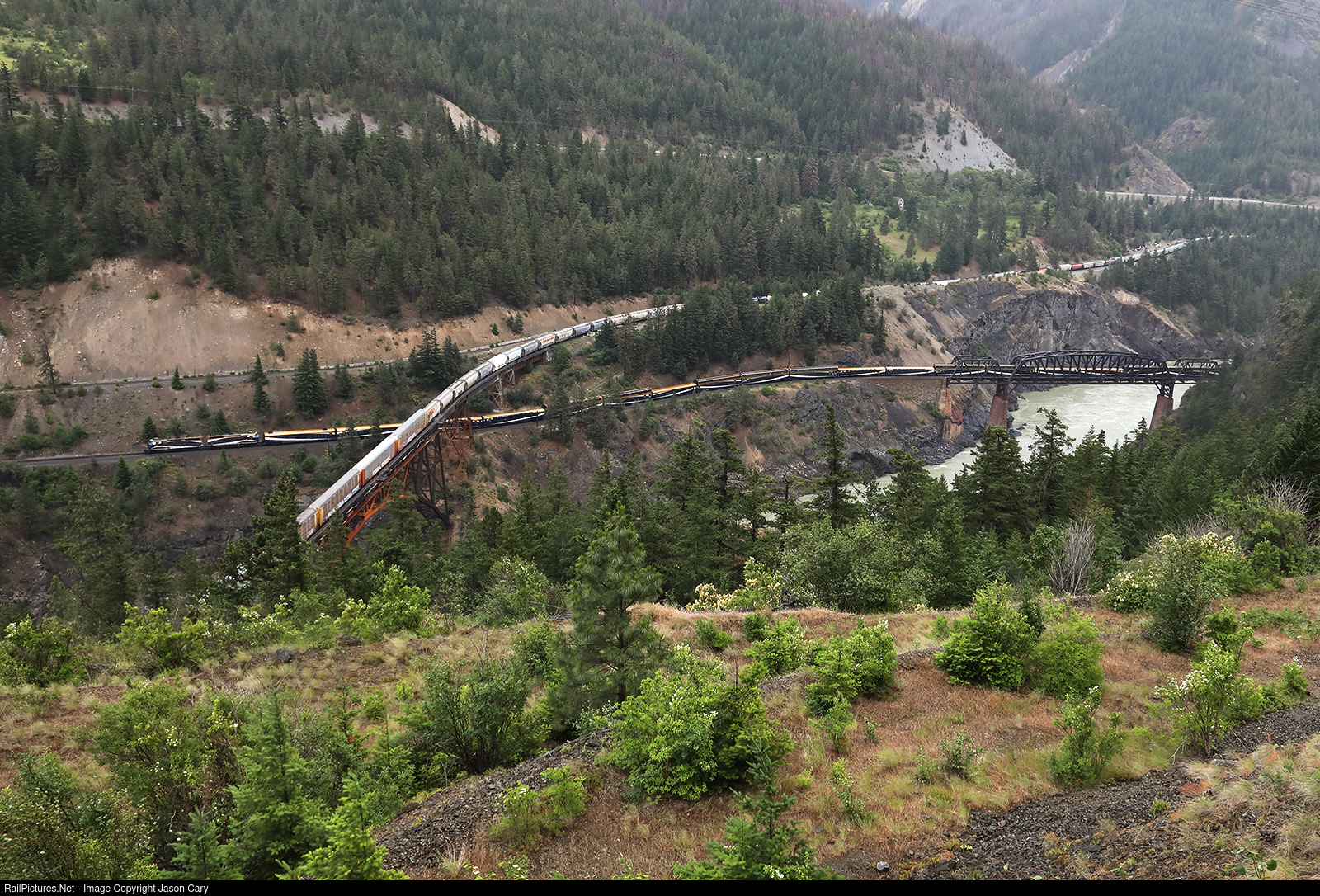 Rocky Mountaineer running on CPKC track slows to give passengers a nice view of the Fraser River. Above a CN manifest crosses over Rocky on the high CN bridge at Cisco, BC. This is not a drone photo.