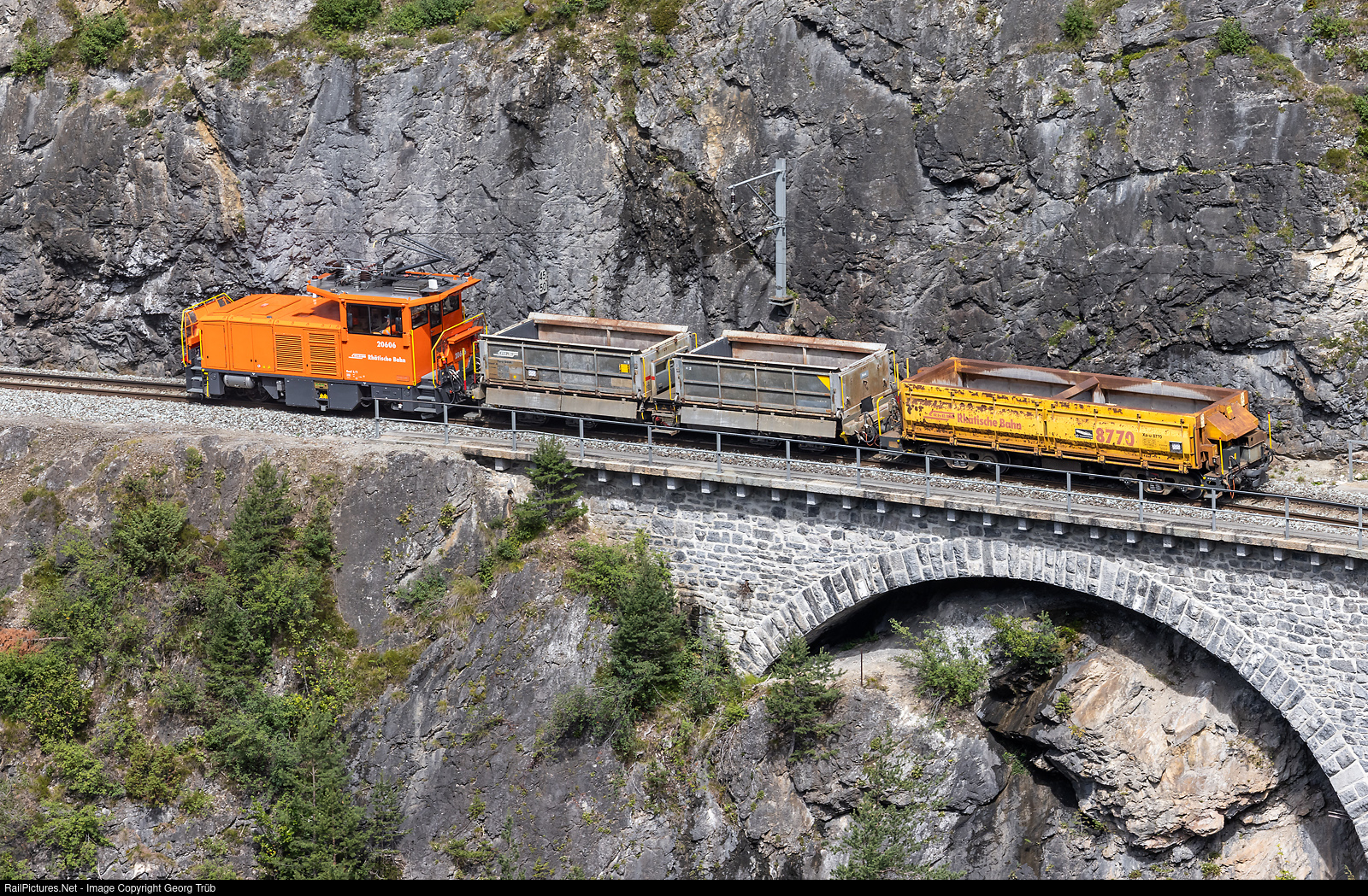 The Rhaetian Railway has seven Geaf 2/2 shunting locomotives with electric and powerful battery drive, # 20601 to # 20607, delivered by StadlerRail in 2020. The maximum velocity is 80 km/h, so they are also used for light freight trains on short routes. But this day, the Geaf 2/2 # 20606, based in Thusis, made a longer journey, to Preda and back, a distance of 44 kilometer. The locomotive just crossed the Landwasser viaduct between Filisur and Alvanenu with train 9130 from Preda to Thusis, pulling two empty Xa-u ballast transport cars.