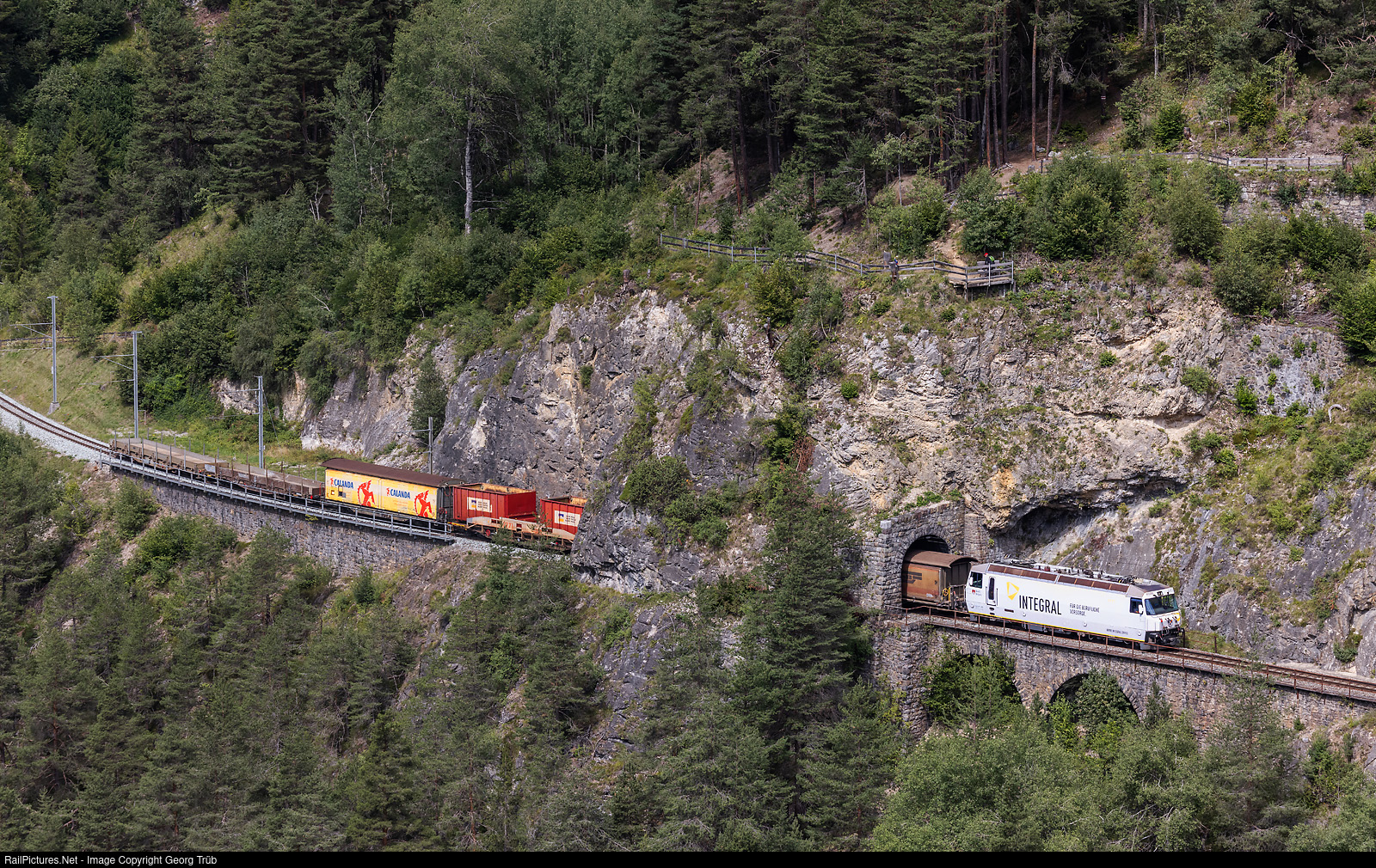 Ge 4/4 III # 642 of the Rhaetian Railway, in the white publicity paint scheme for "INTEGRAL", pulls the freight train 5129 from Chur freight yard to Samedan through the 27 meter long Zalaint tunnel between Alvaneu and Filisur.