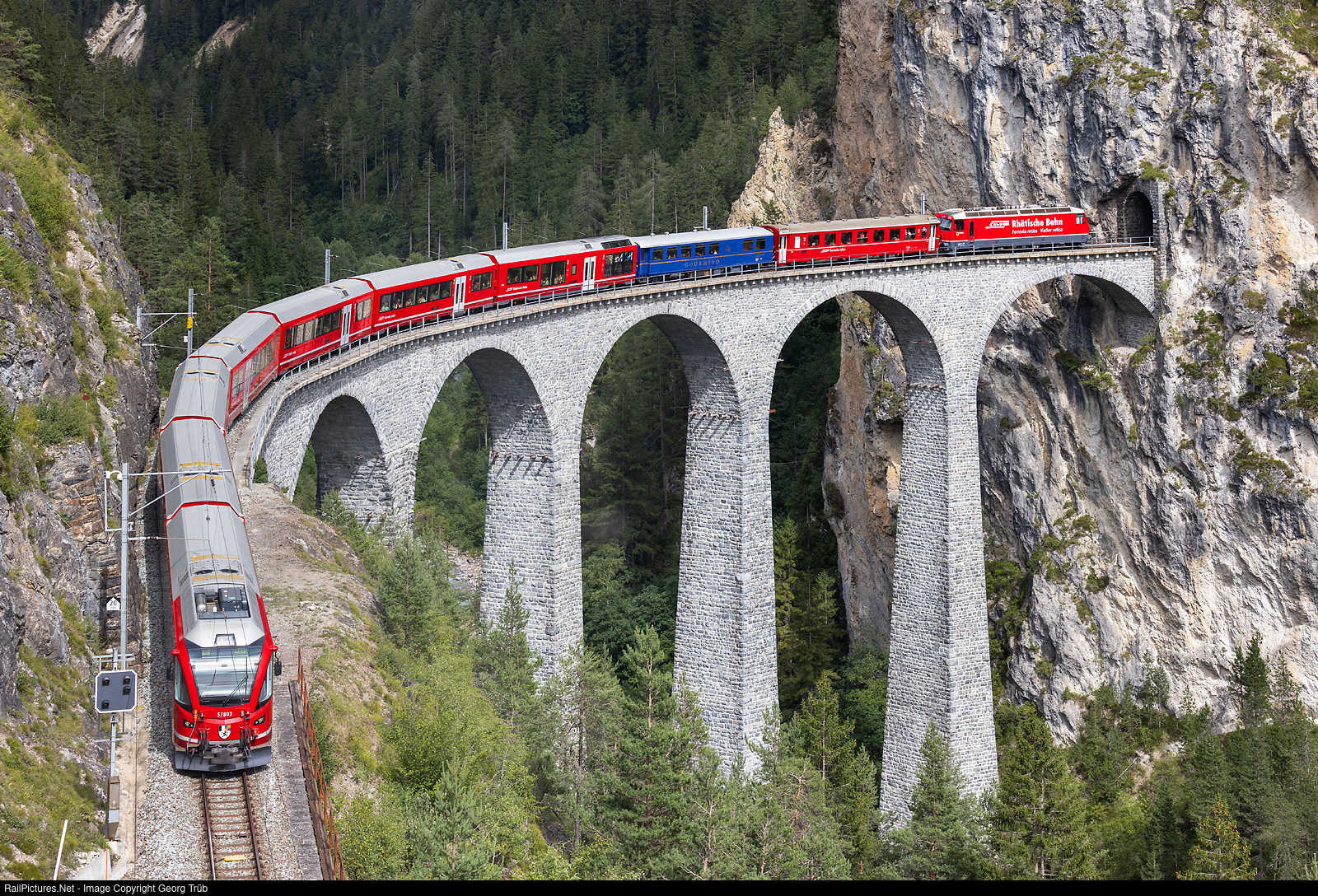 Inter Regio 1152 of the Rhaetian Railway from St.Moritz over the UNESCO world heritage Albula line to Chur, is crossing the 65 meter high and 136 meter long Landwasser viaduct, landmark of the line, between Filisur and Alvaneu. Leading is first class cab car At # 57803, followed by the permanently coupled 6-car ALVRA trainset, the blue GOURMINO dining car WR # 3812, a second class standard car type II as reinforcement and locomotive Ge 4/4 III # 647 "Grüsch" shoving in the rear. The RhB dining cars, which date from the 1930s and have been rebuilt and modernized several times, had to be specially equipped for use in these long push-pull trains on the Albula line.